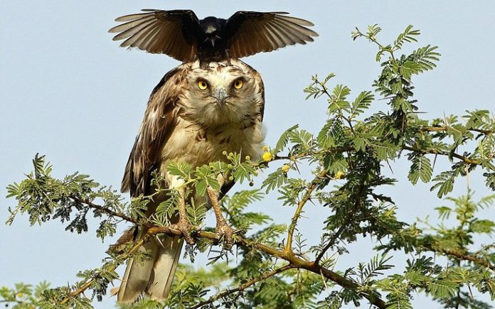 Κύκλους πάνω από αετό που καθόταν σε ένα δέντρο έκανε ένα κοράκι στο Tamilnadu της Ινδίας. Τακτικά κατέβαινε και προσγειωνόταν στο κεφάλι του αρπακτικού, το οποίο δεν κρύβει τη δυσφορία του.