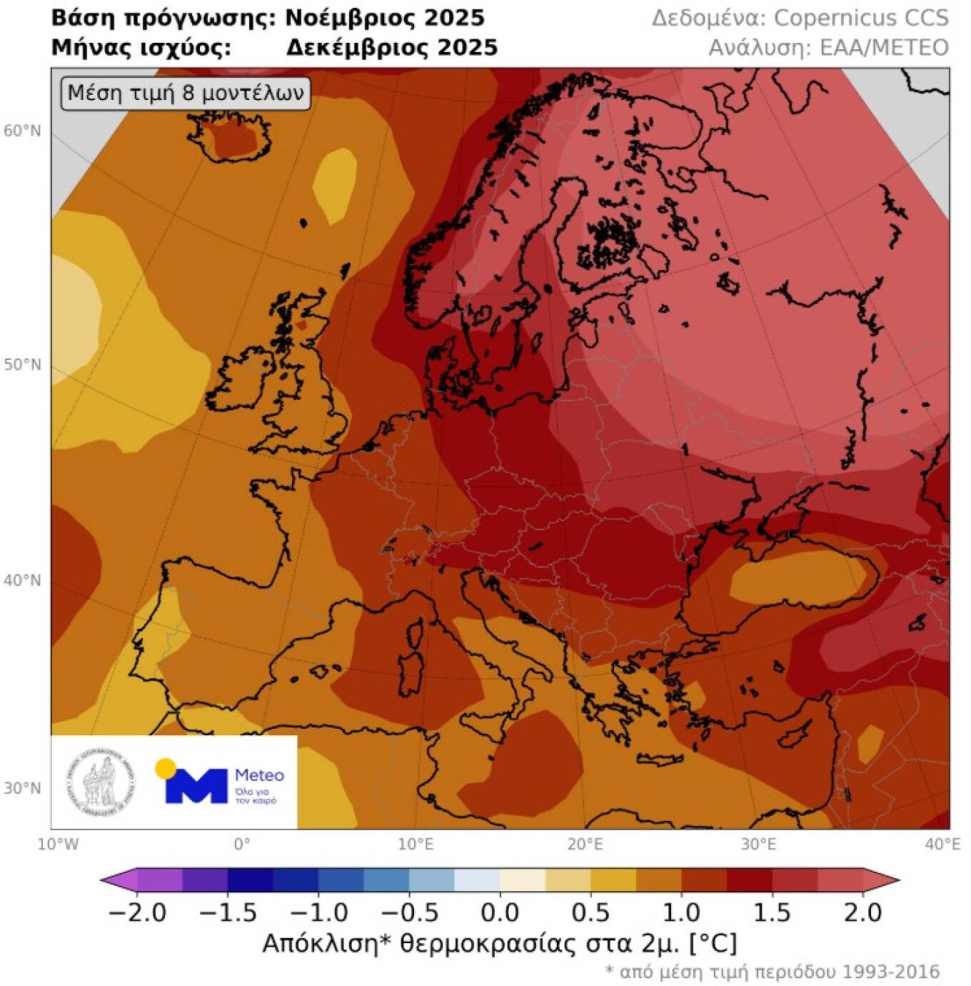Συνολικά για την ευρωπαϊκή ήπειρο, ο χάρτης της Εικόνας 2 απεικονίζει την απόκλιση της μέσης θερμοκρασίας Δεκεμβρίου με βάση την μέση τιμή των 400 σεναρίων. Όπως προκύπτει, θετικές αποκλίσεις αναμένονται σε όλη την ήπειρο, με τις μεγαλύτερες τιμές να εντοπίζονται στην κεντρική και την βορειοανατολική Ευρώπη όπου ξεπερνούν τον +1.5°C.