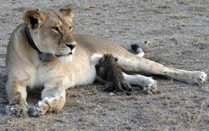 Μπροστά στο μοναδικό θέαμα μιας λέαινας που είχε υιοθετήσει και θήλαζε ένα μικρό λεοπάρδαλης βρέθηκε ένας επισκέπτης σε καταφύγιο προστασίας άγριων ζώων στην Τανζανία.