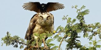 Κοράκι προσγειώνεται πάνω στο κεφάλι αετού