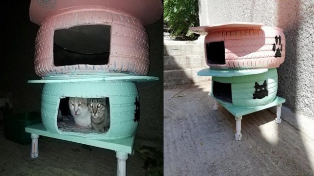 Με παλιά λάστιχα αυτοκινήτου που συνήθως απλά τα πετάμε και μολύνουμε το περιβάλλον, πήρε χρώματα έβαψε και τα έκανε πανέμορφα καταφύγια για τις γάτες!