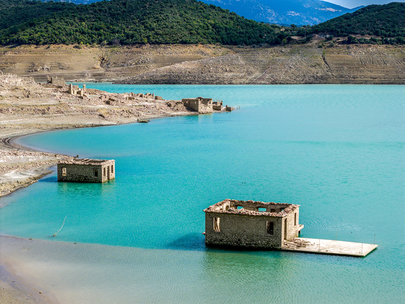 Η δραματική υποχώρηση της στάθμης αποκαλύπτει ένα απόκοσμο τοπίο, με το βυθισμένο χωριό Κάλλιο -όπως φαίνεται και στα πλάνα του drone του Orange Press Agency, από τις 15 Σεπτεμβρίου του 2025- να έχει αναδυθεί, θυμίζοντας εικόνες από την περίοδο της μεγάλης ξηρασίας στις αρχές της δεκαετίας του ’90.