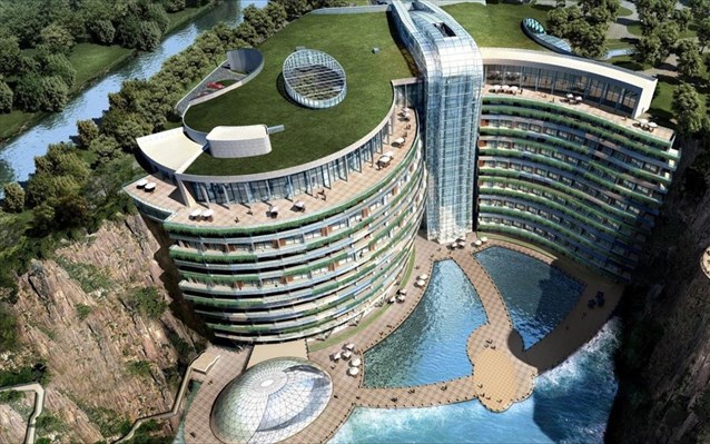 Το «ισόγειο» θα φιλοξενεί πισίνα και άλλες διευκολύνσεις για χαλάρωση, ενώ το ξενοδοχείο θα προσφέρει δυνατότητα για bungee jumping και αναρρίχηση στις πλευρές του λατομείου.