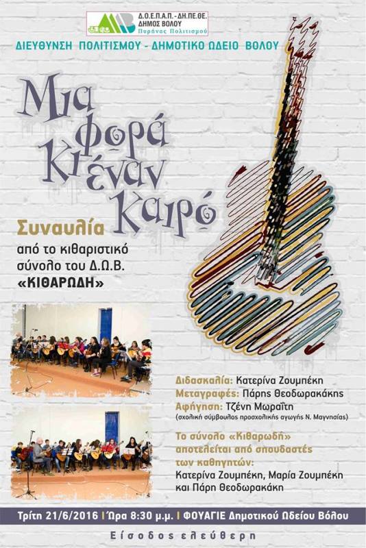 Η Διεύθυνση Πολιτισμού του Δ.Ο.Ε.Π.Α.Π. – ΔΗ.ΠΕ.ΘΕ. Δ. Βόλου παρουσιάζει στο πλαίσιο της Ημέρας της Μουσικής, την Τρίτη 21 Ιουνίου και ώρα 20:30, μία εξαιρετική συναυλία με τίτλο «Μια φορά και έναν καιρό» με το καθαριστικό σύνολο ΚΙΘΑΡΩΔΗ του Δημοτικού Ωδείου Βόλου.