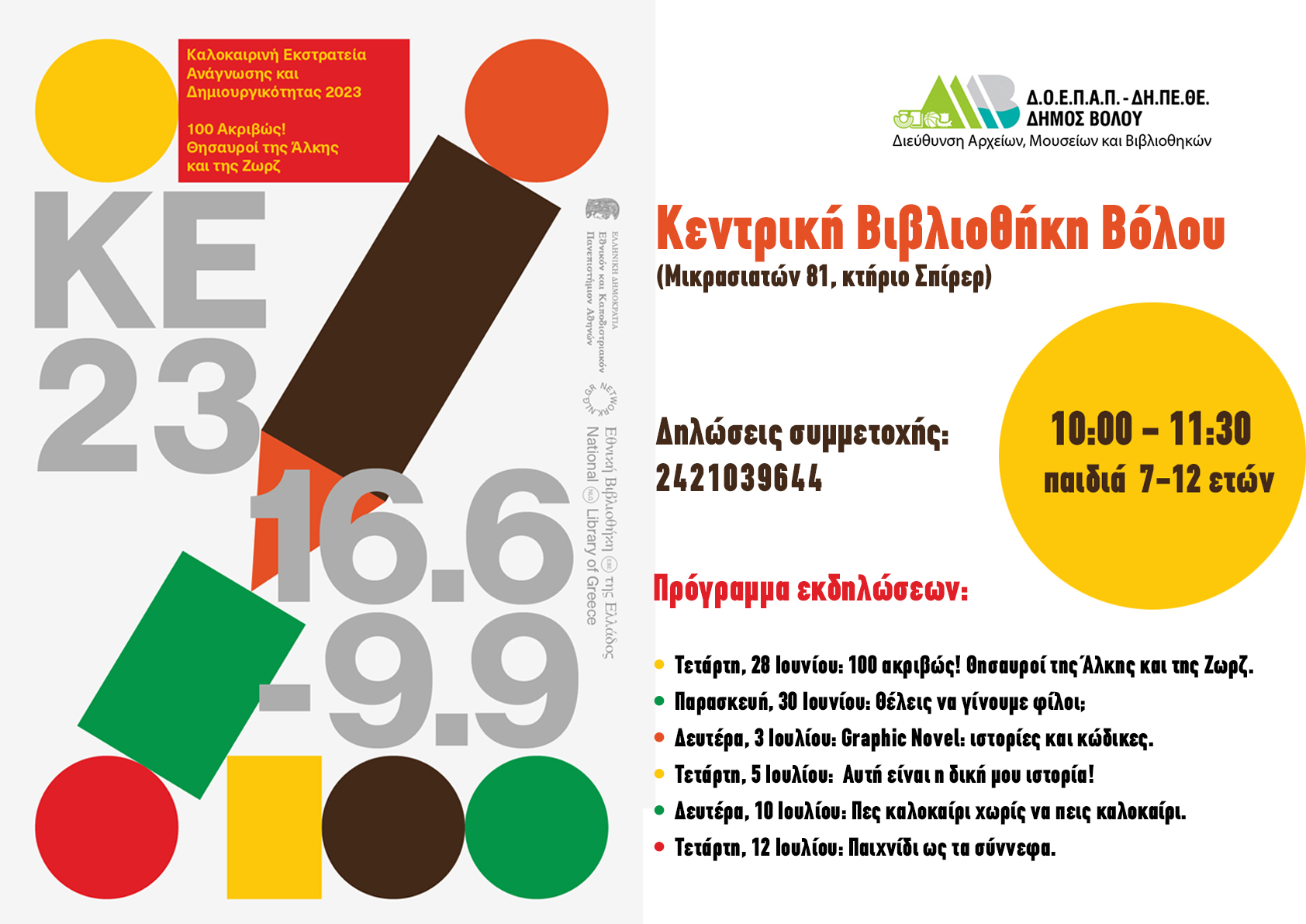 Η Διεύθυνση Αρχείων, Μουσείων, Βιβλιοθηκών του ΔΟΕΠΑΠ-ΔΗΠΕΘΕ Δήμου Βόλου συμμετέχει στην Καλοκαιρινή Εκστρατεία του δικτύου βιβλιοθηκών της Εθνικής Βιβλιοθήκης της Ελλάδος (ΕΒΕ) με τίτλο «100 ακριβώς! Θησαυροί της Άλκης και τη Ζωρζ…», αφιερωμένη στις αγαπημένες συγγραφείς μικρών και μεγάλων Άλκη Ζέη και Ζώρζ Σαρή.
