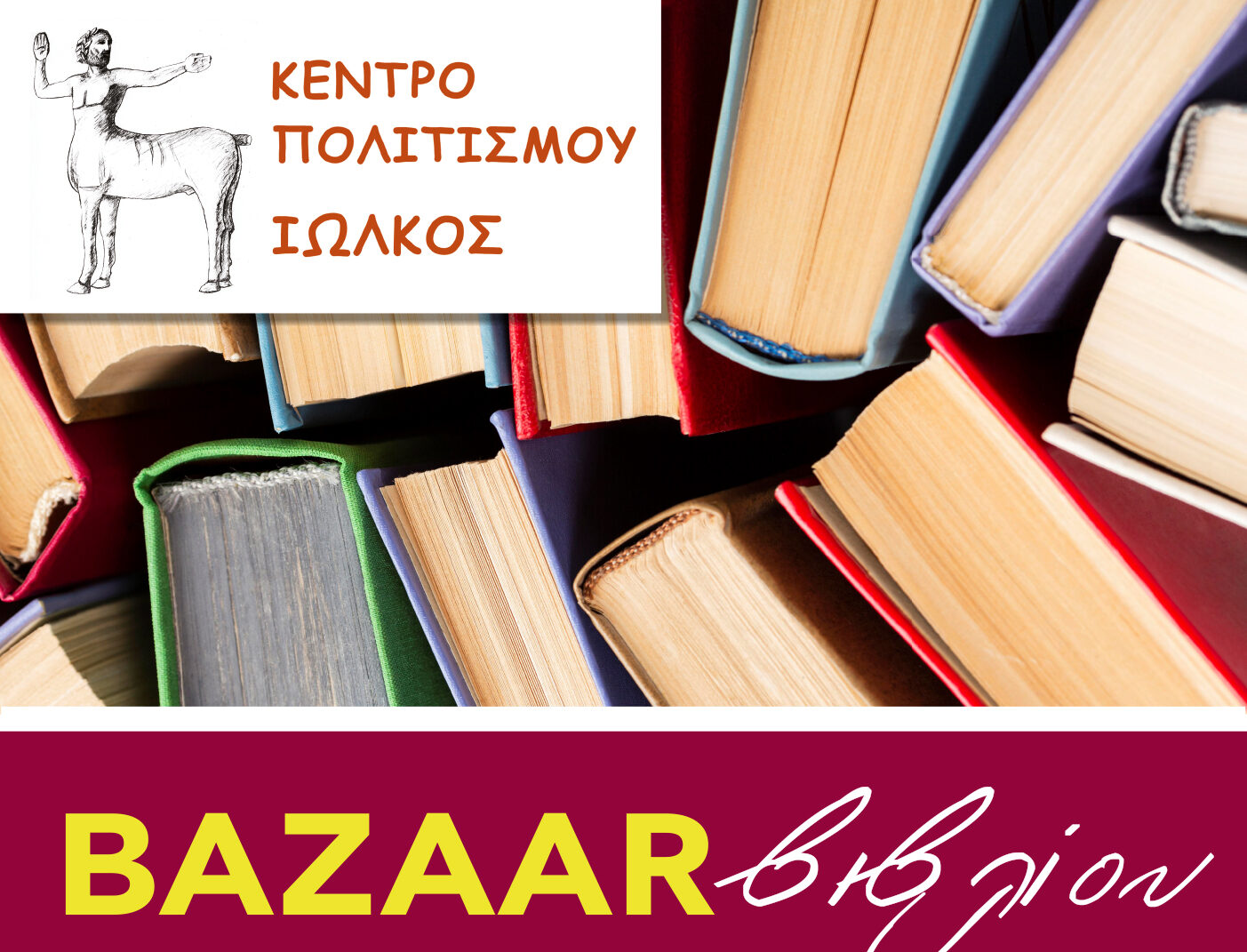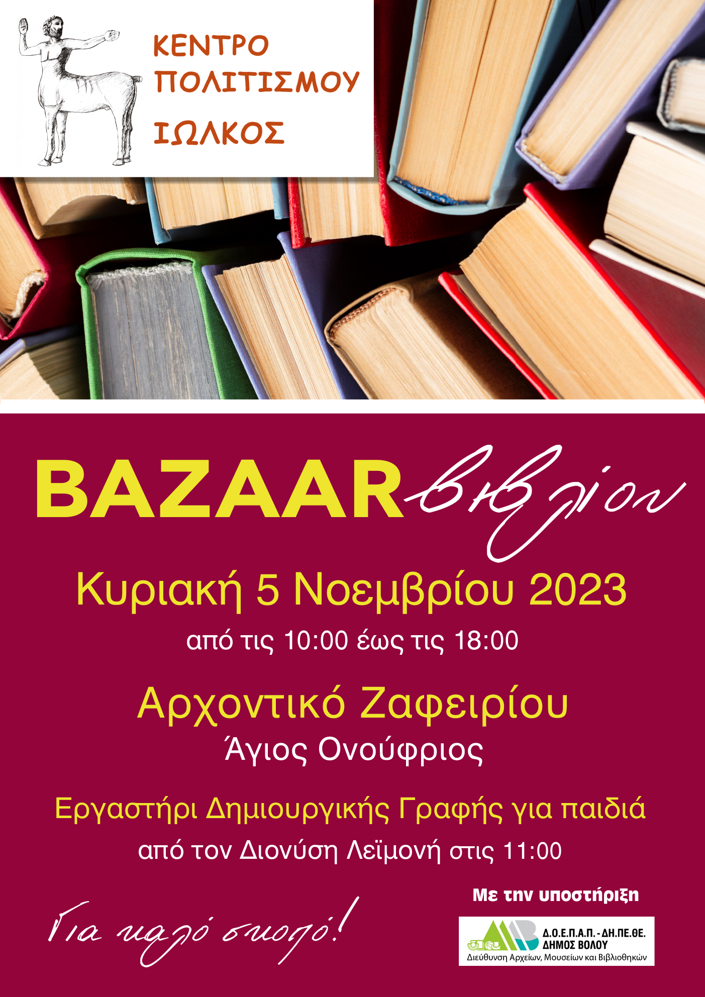 Το Κέντρο Πολιτισμού «Ιωλκός» διοργανώνει για 11η χρονιά Bazaar βιβλίου, την Κυριακή 5 Νοεμβρίου 2023, στην όμορφη αυλή του Αρχοντικού Ζαφειρίου στον Αγ. Ονούφριο , από τις 10 π.μ. έως τις 6 μ.μ.