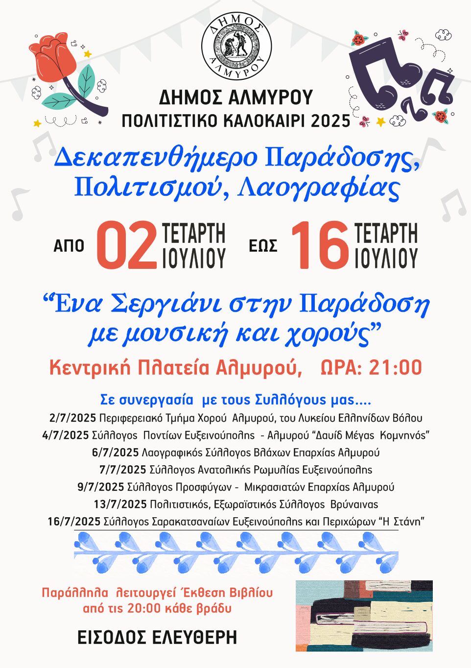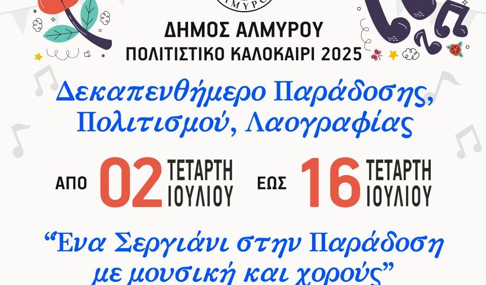 Από σήμερα 2 έως τις 16 Ιουλίου στην Κεντρική Πλατεία Αλμυρού, ξεκινά ένα 15ήμερο Παράδοσης, Πολιτισμού & Λαογραφίας, στα πλαίσια του “Καλοκαιριού Πολιτισμού 2025”.