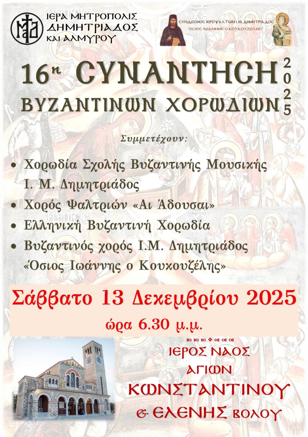 Το 16ο Φεστιβάλ Βυζαντινών Χορωδιών της Ιεράς Μητροπόλεως Δημητριάδος θα πραγματοποιηθεί σήμερα, Σάββατο 13/12, στις 6.30 μ.μ., στον Ιερό Ναό Αγίων Κωνσταντίνου και Ελένης Βόλου, υπό την αιγίδα του Σεβ. Μητροπολίτου Δημητριάδος κ. Ιγνατίου.