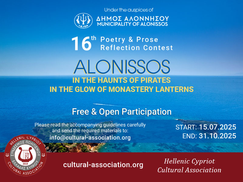 Ο Σύνδεσμος Πολιτισμού Ελλάδας Κύπρου (ΣΠΕΚ) υπό την αιγίδα του Δήμου Αλοννήσου προχώρησε στον 16ο Διεθνή Διαγωνισμό Ποίησης και Πεζόμορφου Στοχασμού, με τίτλο: «Αλόννησος – Στα λημέρια των πειρατών, στα καντηλέρια των μοναστηριών». Ένα λογοτεχνικό ταξίδι αφιερωμένο σε ένα από τα πιο εμπνευσμένα νησιά της Μεσογείου – την Αλόννησο.