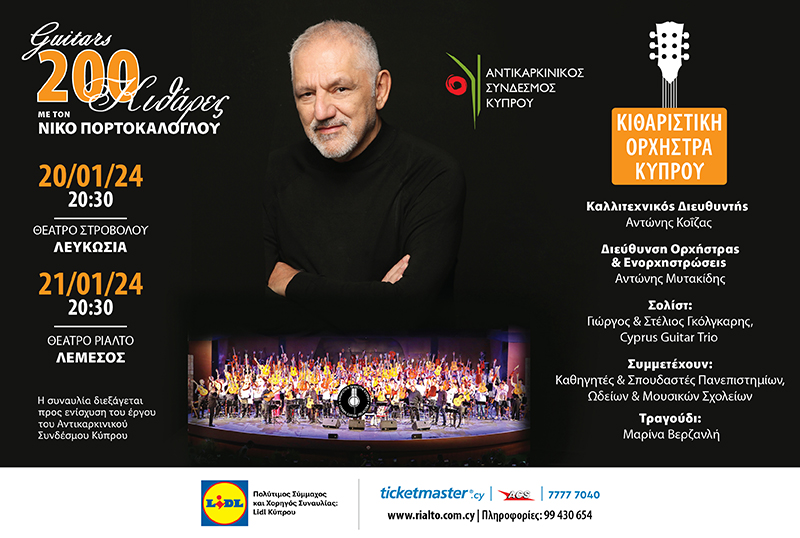 Πρόκειται για μια ιδιαιτέρως ενδιαφέρουσα μουσική συνύπαρξη επί σκηνής, μια ανατρεπτική συναυλία της Κιθαριστικής Ορχήστρας Κύπρου και του αγαπημένου όλων Νίκου Πορτοκάλογλου σε δύο συναυλίες όπου όλα τα έσοδα θα δοθούν για ενίσχυση του έργου του Αντικαρκινικού Συνδέσμου Κύπρου.