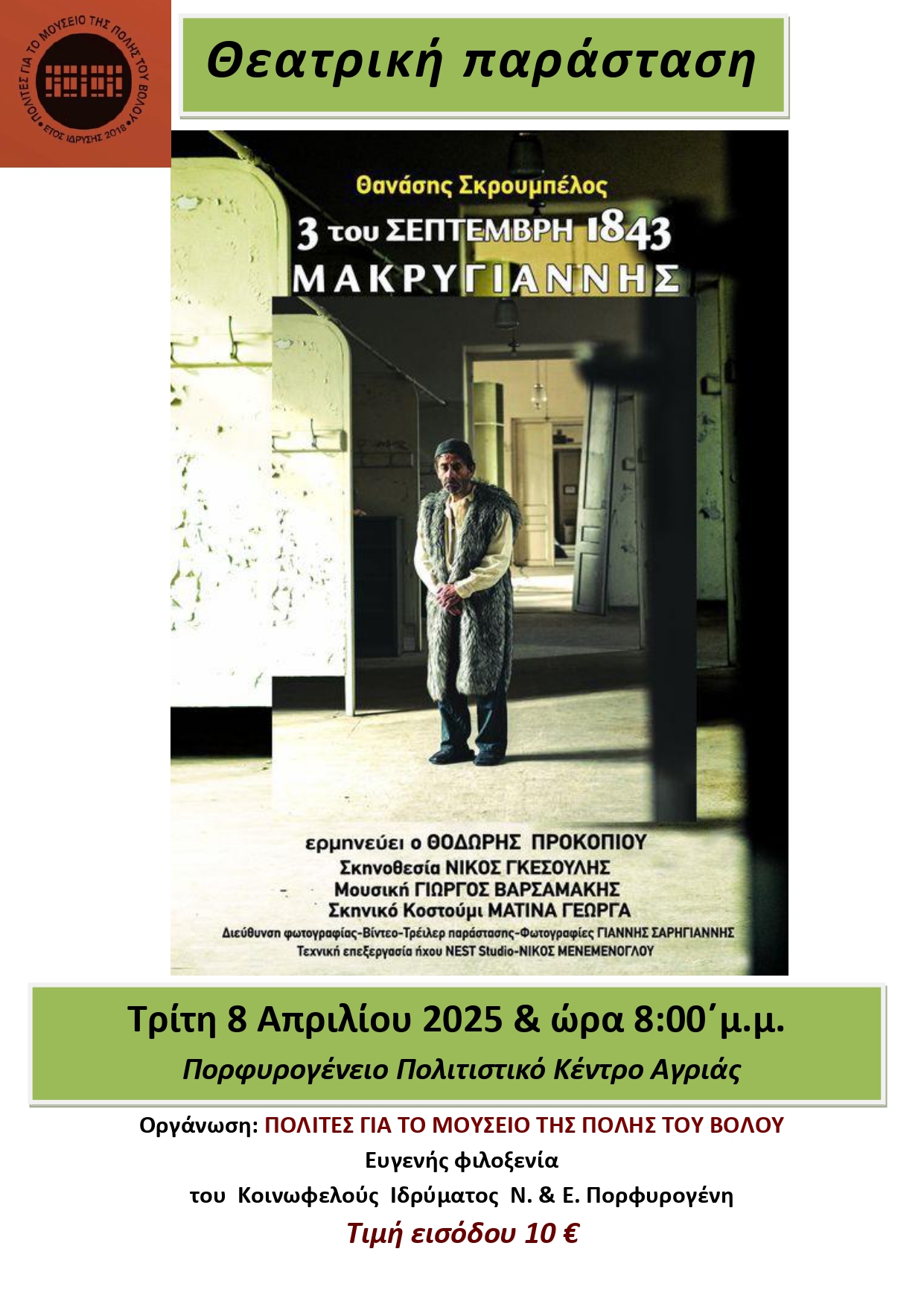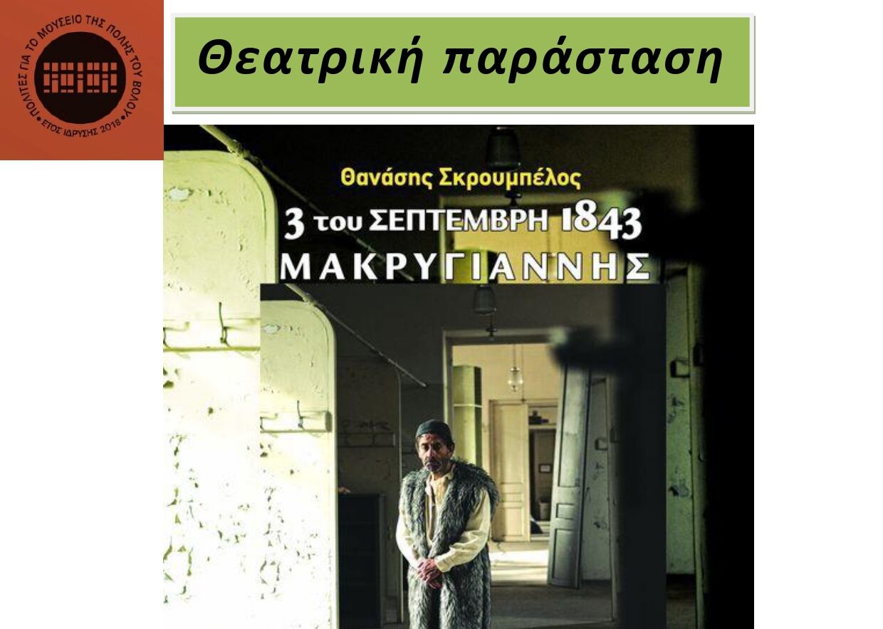 Το σωματείο Πολίτες για το Μουσείο της Πόλης του Βόλου παρουσιάζει στο Πορφυρογένειο Πολιτιστικό Κέντρο Αγριάς, την Τρίτη 8 Απριλίου στις 8:00μ.μ. το νέο θεατρικό έργο του Θανάση Σκρουμπέλου, με θέμα τον Στρατηγό Μακρυγιάννη και την λαϊκή εξέγερση της 3ης Σεπτέμβρη 1843, σε σκηνοθεσία Νίκου Γκεσούλη και σε ερμηνεία Θοδωρή Προκοπίου.
