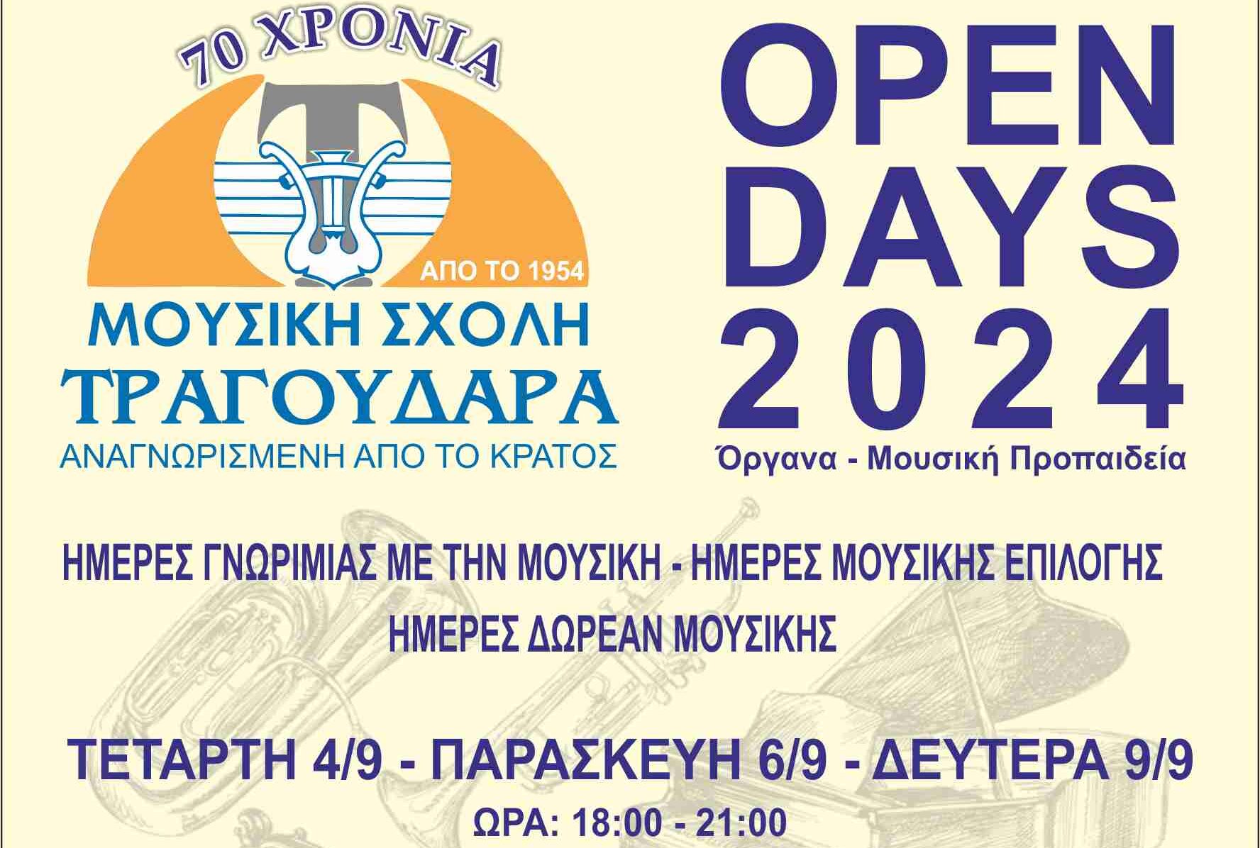 Η Μουσική Σχολή Τραγουδάρα γιορτάζοντας τα 70 χρόνια προσκαλεί όλους στις δωρεάν ημέρες μουσικής! Ειδικότερα την Τετάρτη 4/9 , την Παρασκευή 6/9 και την Δευτέρα 9/9 από τις 6 το απόγευμα έως τις 9 το βράδυ, οι ενδιαφερόμενοι θα ενημερωθούν για όλα τα μουσικά όργανα και τα τμήματα μουσικής προπαιδείας και θα παρακολουθήσουν δωρεάν δοκιμαστικά μαθήματα οργάνων.