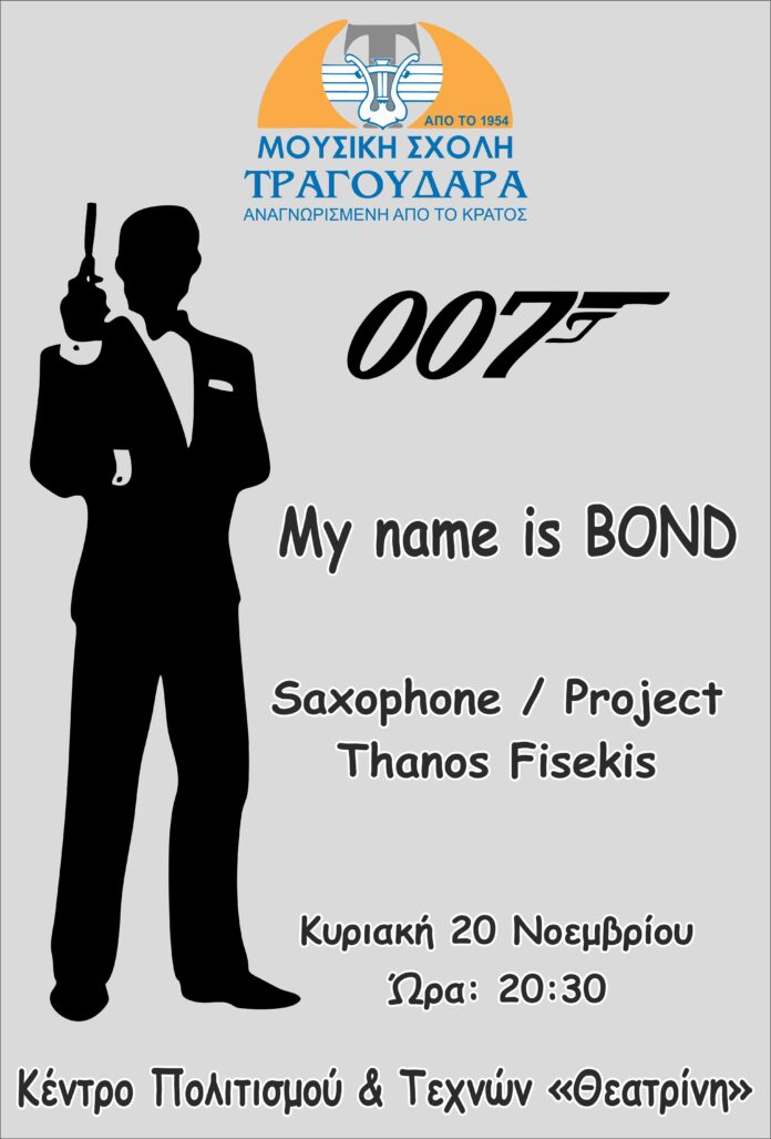 Η Μουσική Σχολή Τραγουδάρα παρουσιάζει στο Κέντρο Πολιτισμού και Τεχνών ‘’Θεατρίνη ‘’ την Κυριακή 20 Νοεμβρίου και ώρα 20.30΄ οπτικοακουστική παράσταση (διάρκειας 50 λεπτών ) με αποσπάσματα από τις ταινίες του James Bond . Project – Saxophone live : Θάνος Φυσέκης