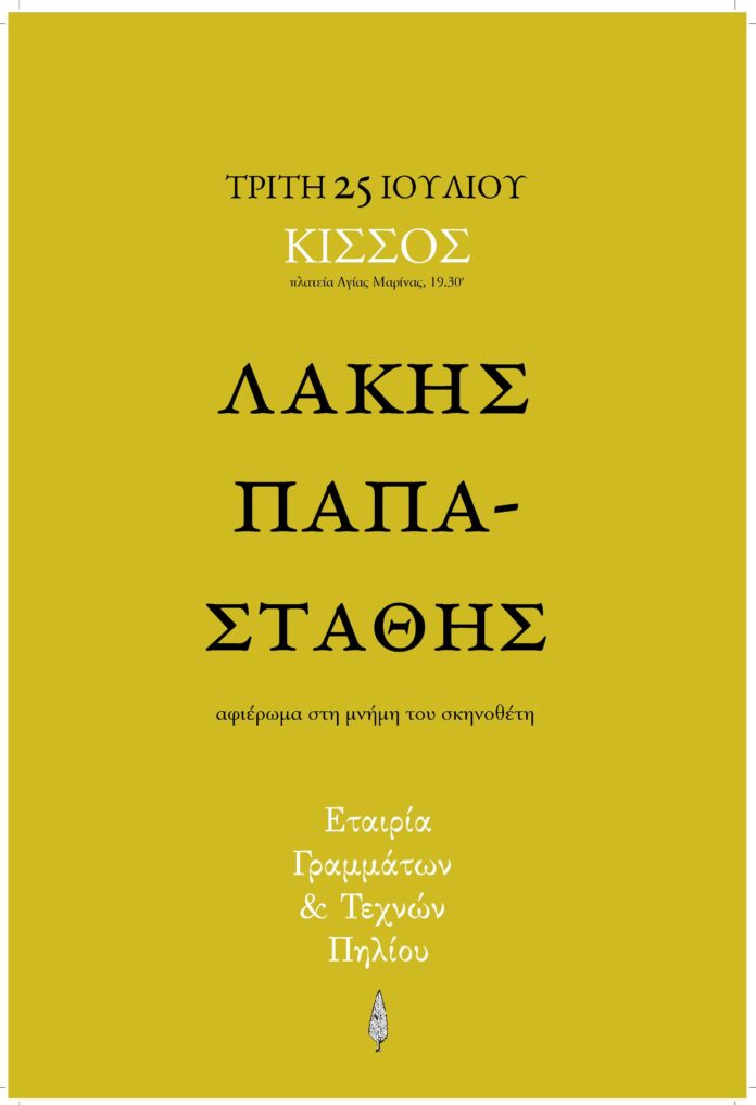 Αφιέρωμα ετοιμάζει στον Κισσό Πηλίου, την Τρίτη 25 Ιουλίου η «Εταιρία Γραμμάτων και Τεχνών Πηλίου», στη μνήμη του «αγαπημένου φίλου και μέλους μας, σκηνοθέτη Λάκη Παπαστάθη, που μας άφησε φέτος στην αρχή της χρονιάς. Θα μιλήσει ο φίλος του συγγραφέας Γιάννης Κιουρτσάκης, θα ακολουθήσει συναυλία με βιολοντσέλα του φεστιβάλ Πηλίου και θα κλείσουμε με προβολή της ταινίας του Παπαστάθη “ο Ζωγράφος Παγώνης και η εκπαίδευση στην Τουρκοκρατία”.