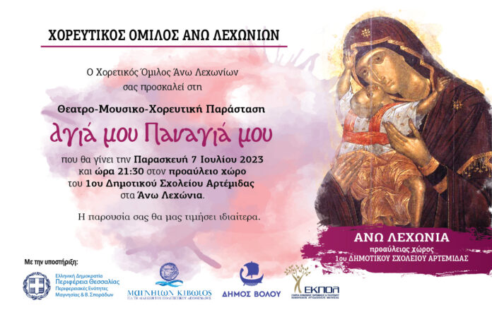 Μία θεατρική – μουσικοχορευτική παράσταση του Χορευτικού Ομίλου Άνω Λεχωνίων αφιερωμένη στη μητέρα όλων, την Παναγία πραγματοποιείται απόψε Παρασκευή 7 Ιουλίου στις 21.30 στον προαύλιο χώρο του 1ου Δημοτικού Σχολείου Αρτέμιδας στα Άνω Λεχώνια.