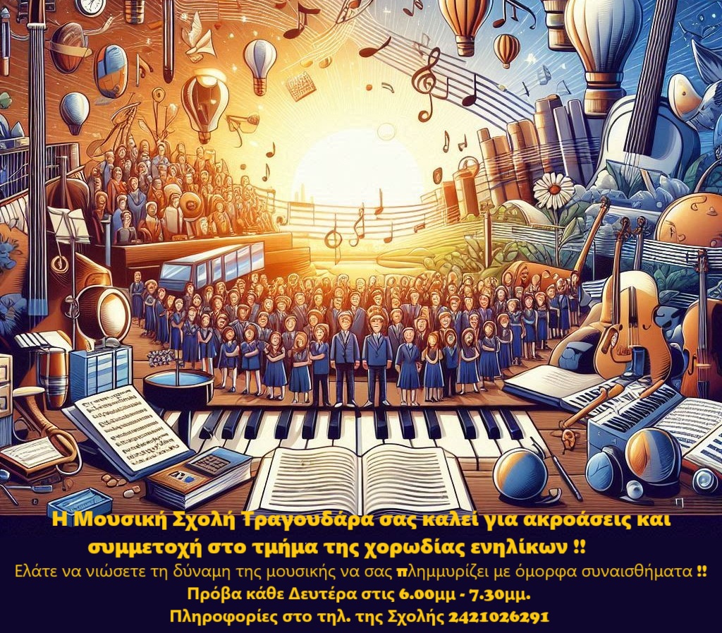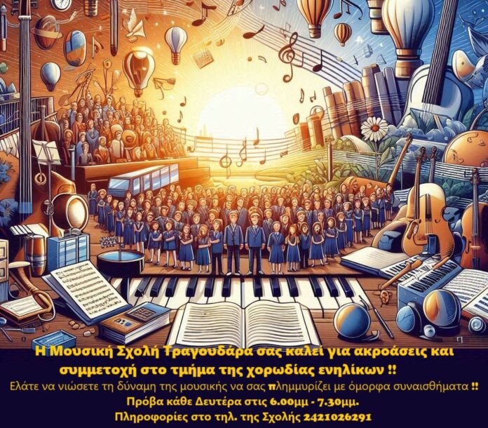 Η Μουσική Σχολή Τραγουδάρα καλεί όλους για ακροάσεις και συμμετοχή στο τμήμα της χορωδίας ενηλίκων. «Ελάτε να νιώσετε τη δύναμη τα μουσικής να σας πλημμυρίζει με όμορφα συναισθήματα», επισημαίνεται χαρακτηριστικά. Οι πρόβες της χορωδίας γίνονται κάθε Δευτέρα από τις 6 έως τις 7.30 το απόγευμα. Πληροφορίες στο τηλέφωνο της Σχολής: 2421026291.
