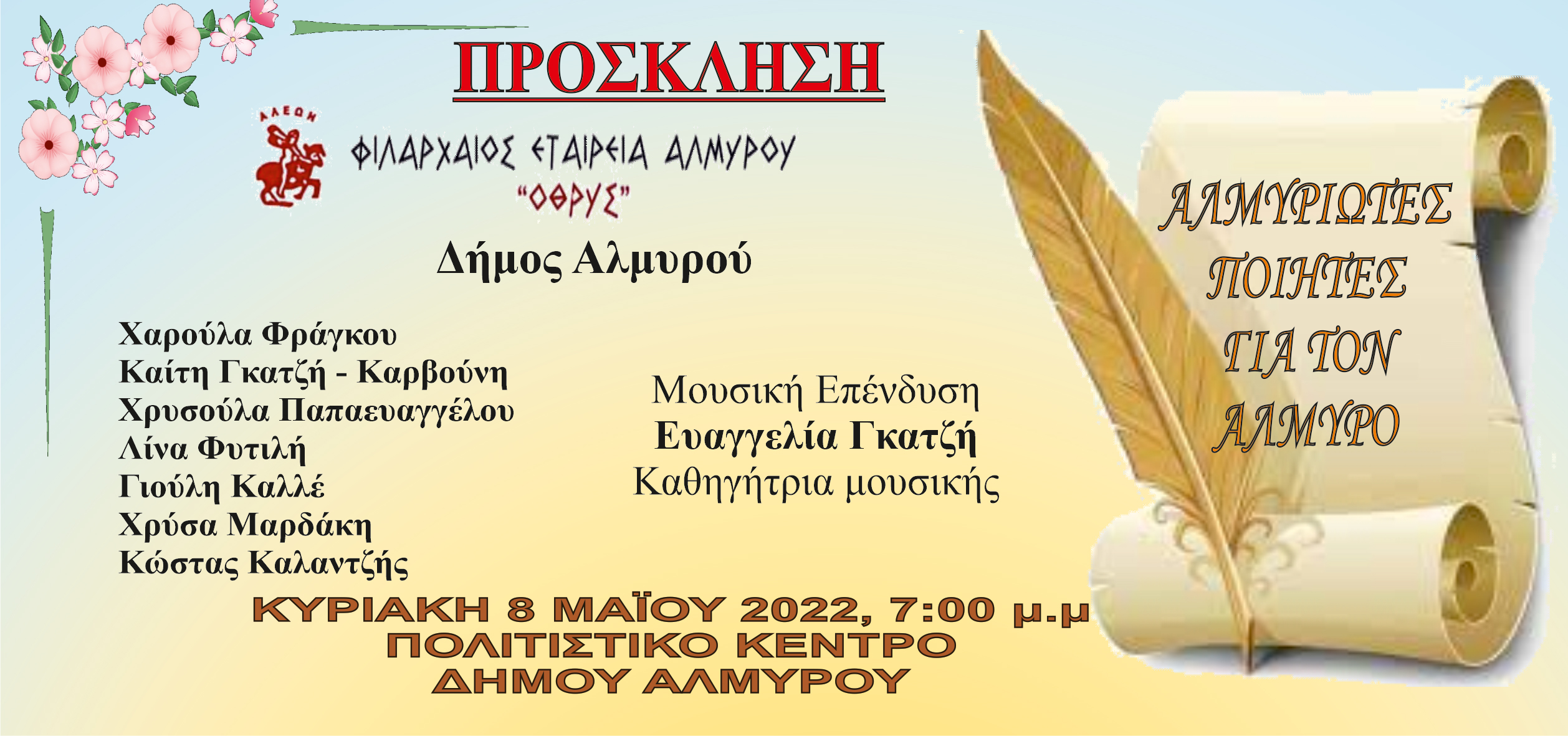Η Φιλάρχαιος Εταιρεία Αλμυρού «ΟΘΡΥΣ» σε συνεργασία με τον Δήμο Αλμυρού διοργανώνουν και μας προσκαλούν στην Ποιητική Βραδιά με θέμα: « Αλμυριώτες Ποιητές για τον Αλμυρό» στο Πολιτιστικό Κέντρο του Δήμου Αλμυρού την Κυριακή 8 Μαΐου 2022, ώρα 7 μμ. Στην εκδήλωση θα απαγγείλουν ποιήματά τους οι: Χαρούλα Φράγκου, Καίτη Γκατζή , Χρυσούλα Παπαευαγγέλου, Λίνα Φυτιλή, Ηλίας Καλλές (απαγγελία: Γιούλη Καλλέ), Χρύσα Μαρδάκη, Κώστας Καλαντζής (απαγγελία: Βασίλης Φυτιλής).