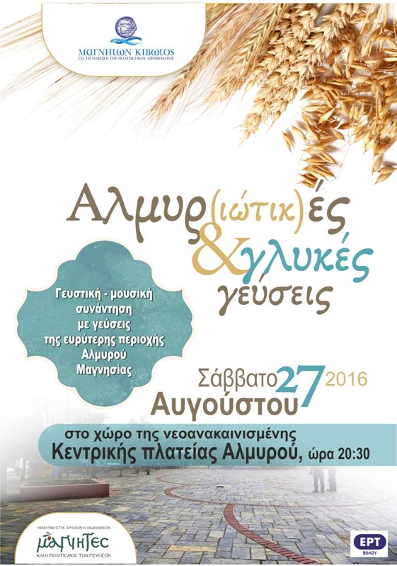 Η νέα εκδήλωση, τιτλοφορείται ως Αλμυρ(ιώτικ)ές και γλυκές γεύσεις με τη συνεργασία φορέων της περιοχής Αλμυρού και θα γίνει το Σάββατο 27 Αυγούστου 2016 , ώρα 20.30 στην Κεντρική Πλατεία Αλμυρού.