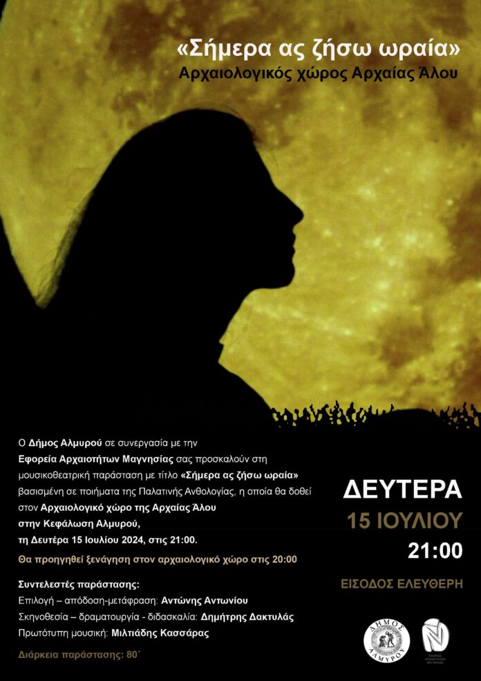 Ο Δήμος Αλμυρού, σε συνεργασία με την Εφορεία Αρχαιοτήτων Μαγνησίας, παρουσιάζουν τη μουσικοθεατρική παράσταση με τίτλο «Σήμερα ας ζήσω ωραία», βασισμένη σε ποιήματα της Παλατινής Ανθολογίας, στον αρχαιολογικό χώρο της αρχαίας Άλου στον Αλμυρό, τη Δευτέρα 15 Ιουλίου στις 9 το βράδυ. Η παράσταση, η οποία παρουσιάστηκε ήδη με επιτυχία στον κήπο του Αθανασάκειου Αρχαιολογικού Μουσείου Βόλου, ανεβαίνει σε σκηνοθεσία του Δημήτρη Δακτυλά και μετάφραση του Αντώνη Αντωνίου.
