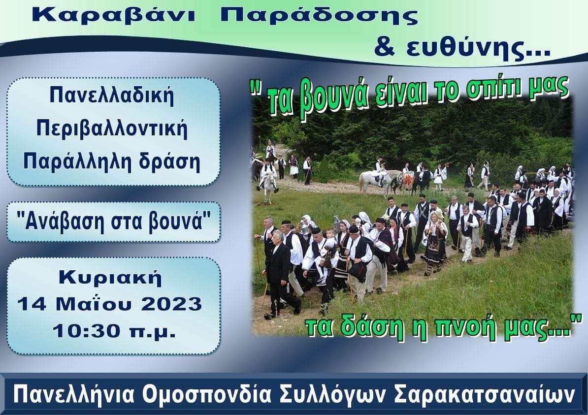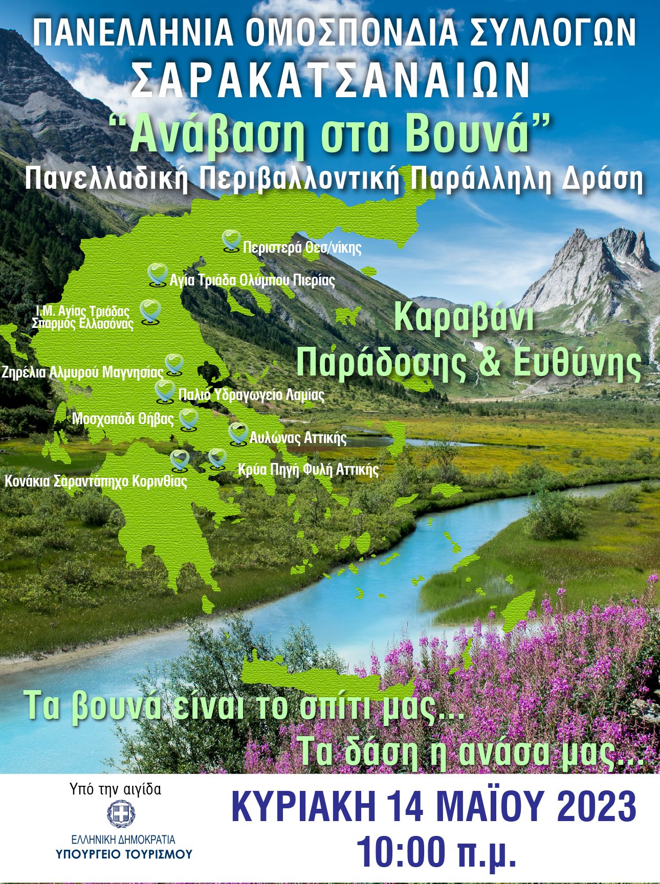 Η Πανελλήνια Ομοσπονδία Συλλόγων Σαρακατσαναίων(Π.Ο.Σ.Σ.)υπό την αιγίδα του Υπουργείου Τουρισμού, διοργανώνει Πανελλαδικά μαζί με τους κατά τόπους συλλόγους, – πιλοτικά για πρώτη φορά-συμβολική ανάβαση στα βουνά την Κυριακή 14Μαΐου 2023στις10.00 το πρωί σε διαφορετικές γεωγραφικές περιοχές ταυτόχρονα.