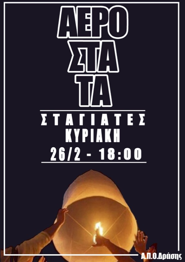 Την Κυριακή 26/2 στις 18.00 για άλλη μια χρονιά οι κάτοικοι των Σταγιατών θα αναβιώσουν το έθιμο του Φανού και καλούν κατοίκους και επισκέπτες να κατασκευάσουν και να υψώσουν τα δικά τους αερόστατα. Το ραντεβού δίνεται στο κεντρικό πάρκινγκ των Σταγιατών.