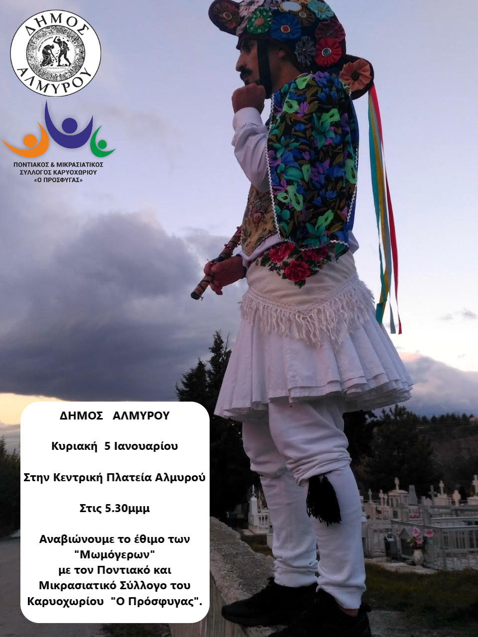 Ο Δήμος Αλμυρού σε συνεργασία με τον Ποντιακό και Μικρασιατικό Σύλλογο Καρυοχωρίου “Ο Πρόσφυγας” αναβιώνουν το έθιμο των “Μωμόγερων” αυτή την Κυριακή 5 Ιανουαρίου 2025 και ώρα 17.30 στην Κεντρική Πλατεία Αλμυρού.