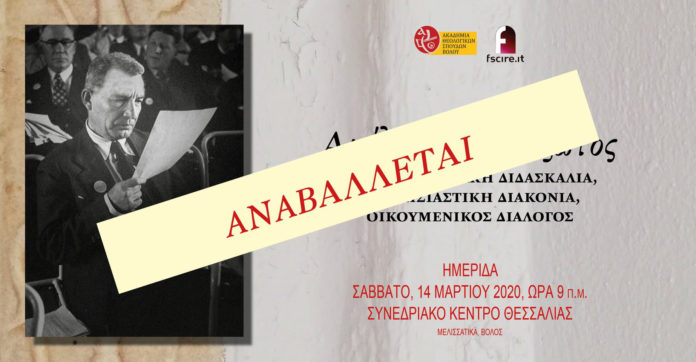 Η ημερίδα με θέμα «Ο Αμίλκας Αλιβιζάτος και η νεοελληνική θεολογία: Πανεπιστημιακή διδασκαλία, εκκλησιαστική διακονία και οικουμενικός διάλογος» που ήταν προγραμματισμένη για το Σάββατο, 14 Μαρτίου 2020 αναβάλλεται, λόγω της έκρυθμης κατάστασης που έχει δημιουργηθεί εξαιτίας του κορωνοϊού. Πολλοί από τους ομιλητές της ημερίδας επρόκειτο να έρθουν από την Ιταλία και άλλες χώρες της Ευρώπης, πράγμα πρακτικά αδύνατον εξαιτίας των μέτρων που έχουν επιβληθεί για την πρόληψη της διάδοσης της νόσου.