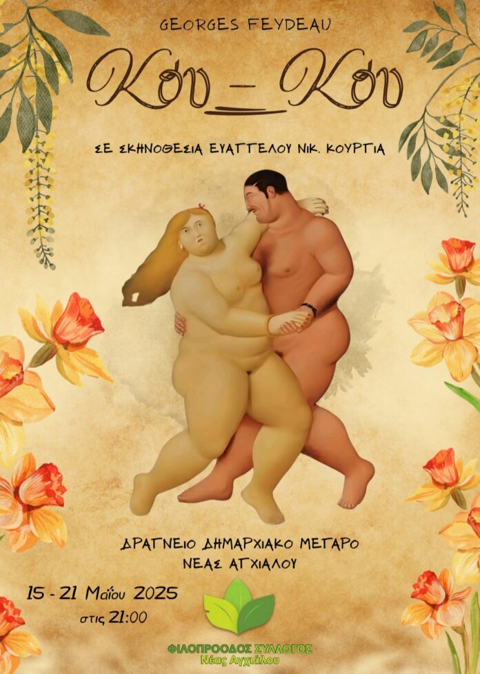 Με πυξίδα την αγάπη για το θέατρο, τη δημιουργία ακόμη καλύτερης επαφής του κοινού με τη συγκεκριμένη μορφή τέχνης, αλλά και την ανάγκη για ατομική και συλλογική έκφραση, η θεατρική ομάδα του Φιλοπρόοδου Συλλόγου Νέας Αγχιάλου παρουσιάζει τη σπαρταριστή κωμωδία καταστάσεων Κου – Κου (Le Dindon) του Georges Feydeau στο Δράγνειο Δημαρχιακό Μέγαρο Νέας Αγχιάλου, από 15 έως και 21 Μαΐου 2025 και ώρα 21:00.