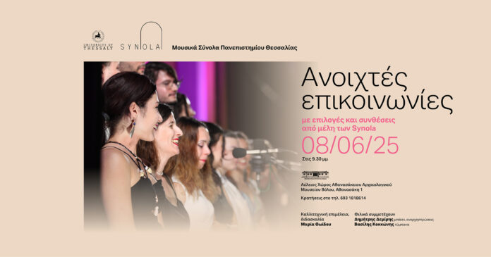 Η Εφορεία Αρχαιοτήτων Μαγνησίας και τα Μουσικά Σύνολα του Πανεπιστημίου Θεσσαλίας διοργανώνουν Συναυλία με τίτλο “Ανοιχτές Επικοινωνίες”, με επιλογές και συνθέσεις των μελών των Συνόλων, την Κυριακή 8 Ιουνίου, στον αύλειο χώρο του Αθανασάκειου Αρχαιολογικού Μουσείου Βόλου, στις 9.30 το βράδυ.