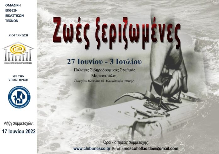 Ο Όμιλος για την UNESCO Τεχνών, Λόγου και Επιστημών Ελλάδος διοργανώνει ομαδική, θεματική έκθεση εικαστικών τεχνών με τίτλο «Ζωές ξεριζωμένες», η οποία θα πραγματοποιηθεί από 27 Ιουνίου ως 3 Ιουλίου 2022, στα βαγόνια του τραίνου του Παλαιού Σιδηροδρομικού Σταθμού Μαρκοπούλου. Η έκθεση πραγματοποιείται με την υποστήριξη του Δήμου Μαρκοπούλου και της Κοινωφελούς Δημοτικής Επιχείρησης Μαρκοπούλου – Μεσογαίας (Κ.Δ.Ε.Μ) και μετά τη λήξη της, θα φιλοξενηθεί διαδικτυακά στην ιστοσελίδα του Ομίλου, καθώς και στις σελίδες του στα δίκτυα Facebook και Youtube.