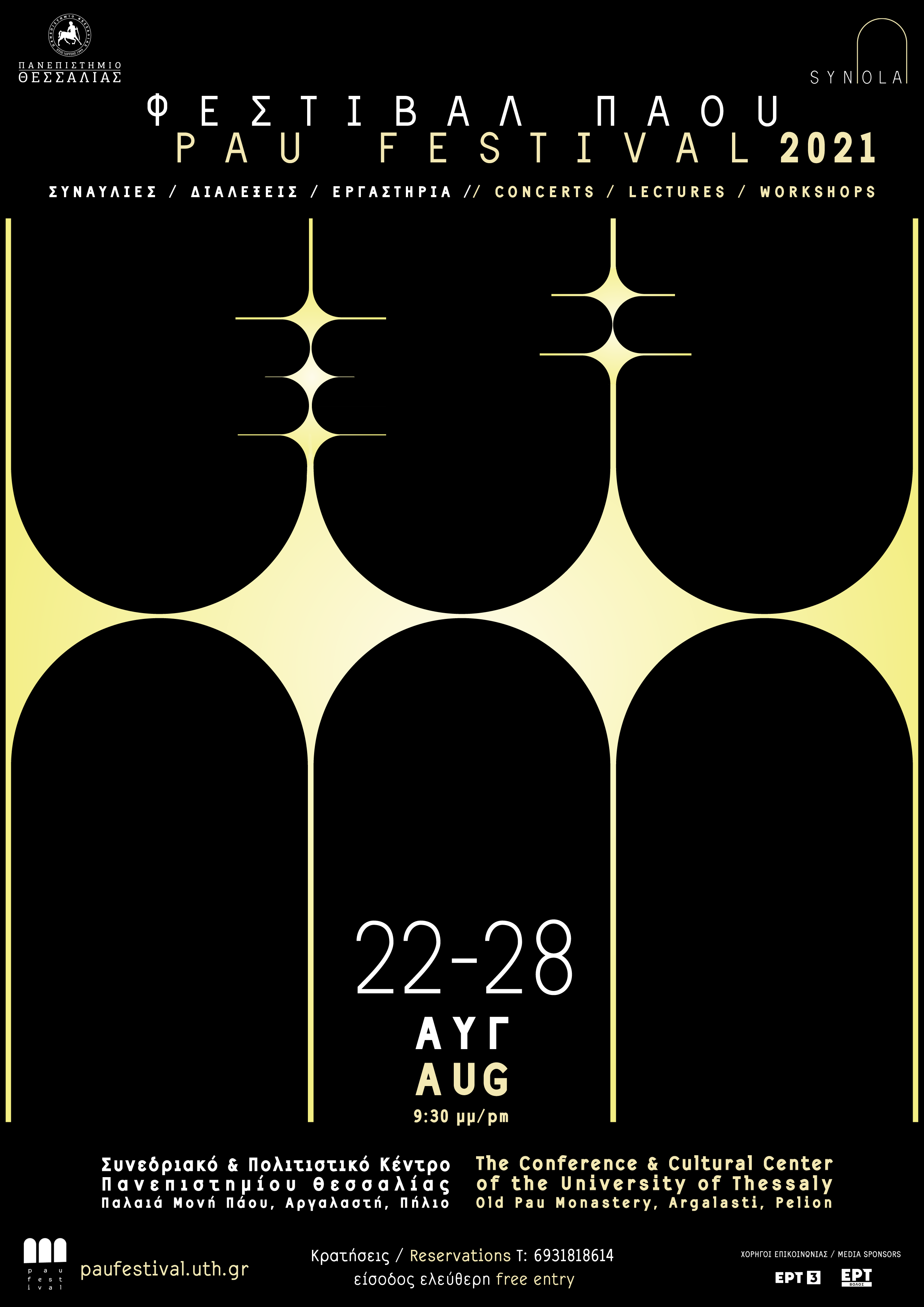 ToΦεστιβάλ Πάου 2021 (paoufestival.uth.gr) θα πραγματοποιηθεί στο Συνεδριακό και Πολιτιστικό Kέντρο Πανεπιστημίου Θεσσαλίας στην Παλαιά Μονή Πάου / ΑργαλαστήΠηλίου (mpaou.uth.gr) από 22 έως 28 Αυγούστου.