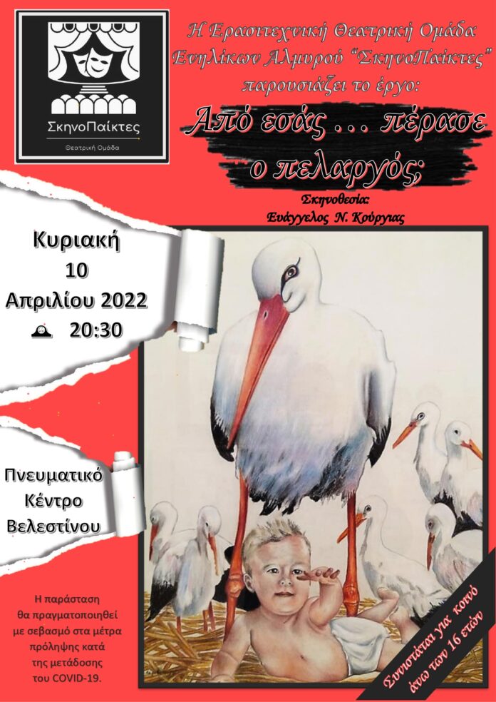 Η Ερασιτεχνική Θεατρική Ομάδα Ενηλίκων Αλμυρού ΣκηνοΠαίκτες παρουσιάζει την παράσταση «Από εσάς … πέρασε ο πελαργός»;. Σύμφωνα με ανακοίνωση, πρόκειται για διασκευή που προέκυψε από αυτοσχεδιασμούς των ηθοποιών και τις σκηνοθετικές κατευθύνσεις, πάνω στο γνωστό έργο των Θανάση Παπαθανασίου και Μιχάλη Ρέππα, «Τα μωρά τα φέρνει ο πελαργός». Η παράσταση θα πραγματοποιηθεί την Κυριακή 10 Απριλίου 2022, στις 20:30, στο Πνευματικό Κέντρο Βελεστίνου.
