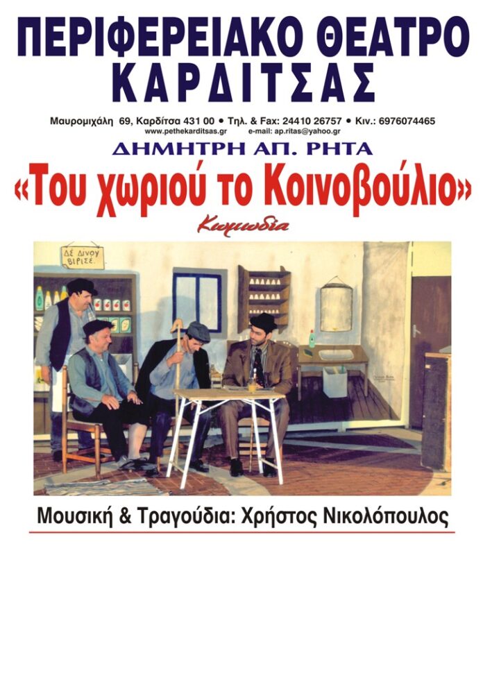 Στις 23-7-2023, Κυριακή, 9 μ.μ., στην αυλή του Δημοτικού Σχολείου Γραικοχωρίου της πόλης Ηγουμενίτσας, το Περιφερειακό Θέατρο Καρδίτσας ξεκινάει τη φετινή θεατρική περιοδεία του, παρουσιάζοντας την εντυπωσιακή κωμωδία: