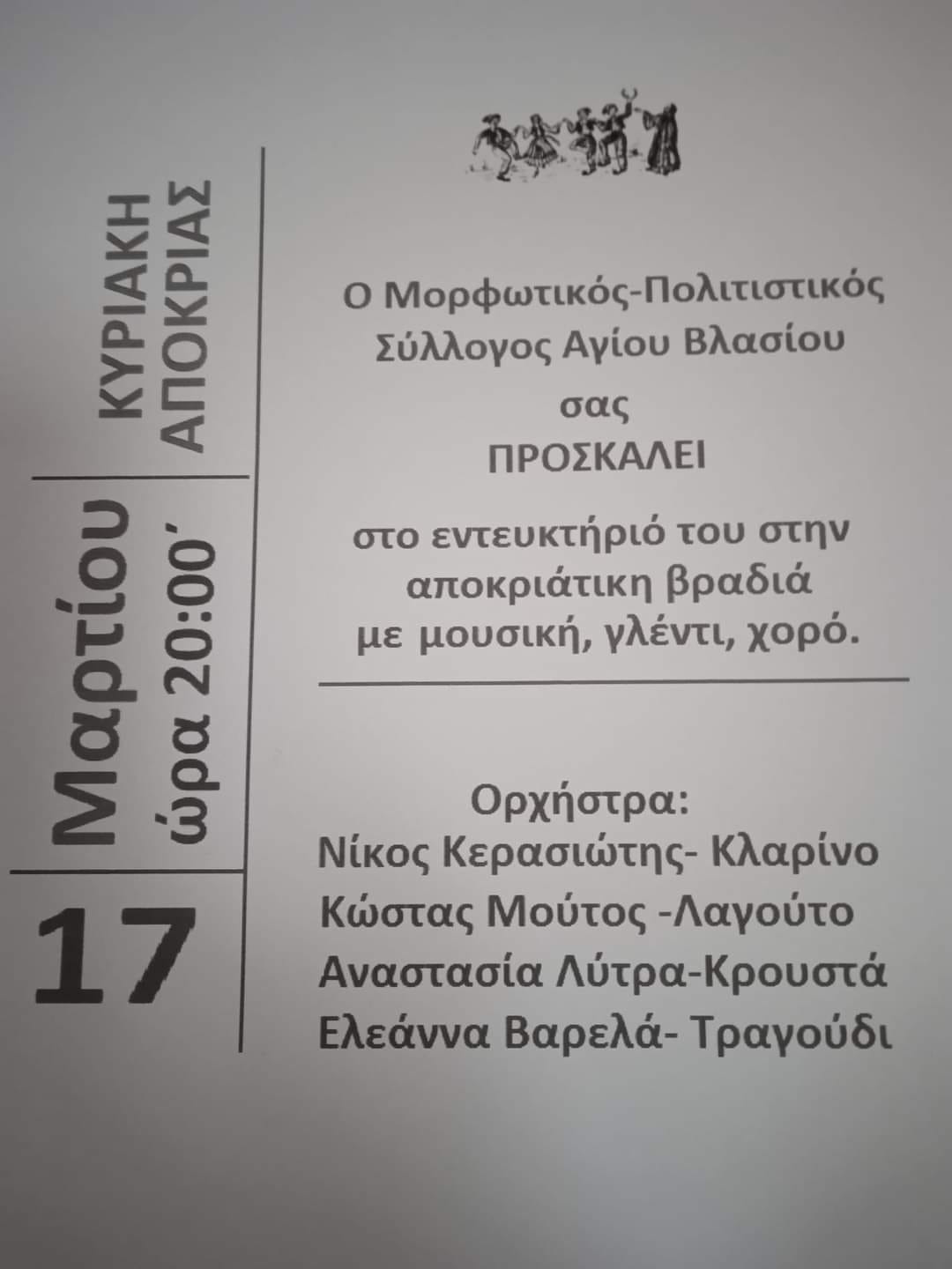 Αποκριάτικο πάρτι διοργανώνεται την Κυριακή 17 Μαρτίου στις 20:00 στο εντευκτήριο του Μορφωτικού- Πολιτιστικού Συλλόγου Αγίου Βλασίου. Θα υπάρχει ορχήστρα με τους: Νίκο Κερασιώτη, κλαρίνο, Κώστα Μούτο, λαγούτο, Αναστασία Λύτρα, κρουστά και Ελεάννα Βαρελά στο τραγούδι.