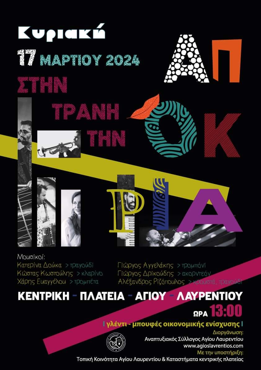 Αποκριάτικο πάρτι την Κυριακή 17 Μαρτίου στις 13:00 στην Κεντρική Πλατεία Αγίου Λαυρεντίου. Θα παίξουν οι μουσικοί: Κατερίνα Δούκα, τραγούδι, Κώστας Κωστούλης, κλαρίνο, Χάρης Ευαγγέλου, τρομπέτα, Γιώργος Αγγελάκης, τρομπόνι, Γιώργος Δρικούδης, ακορντεόν και Αλέξανδρος Ριζόπουλος, κρουστά και τραγούδι.