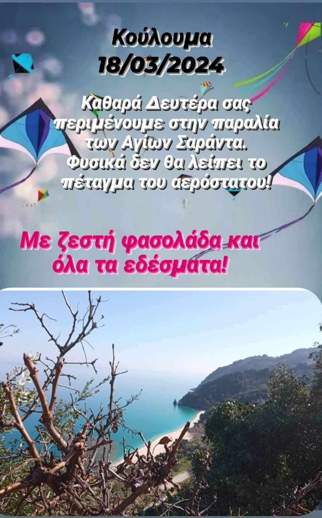Τα Κούλουμα θα εορταστούν και στην παραλία των Αγίων Σαράντα στο Πήλιο την Καθαρά Δευτέρα, ενώ δεν θα λείπει το πέταγμα του αερόστατου. Θα υπάρχει ζεστή φασολάδα και όλα τα εδέσματα.