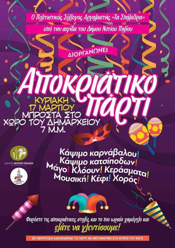 Αποκριάτικο πάρτι στην Αργαλαστή την Κυριακή 17 Μαρτίου στις 7μ.μ. μπροστά από τον χώρο του Δημαρχείου. Σε περίπτωση κακοκαιρίας το πάρτι θα μεταφερθεί στο κτήριο του ΚΕΓΕ.