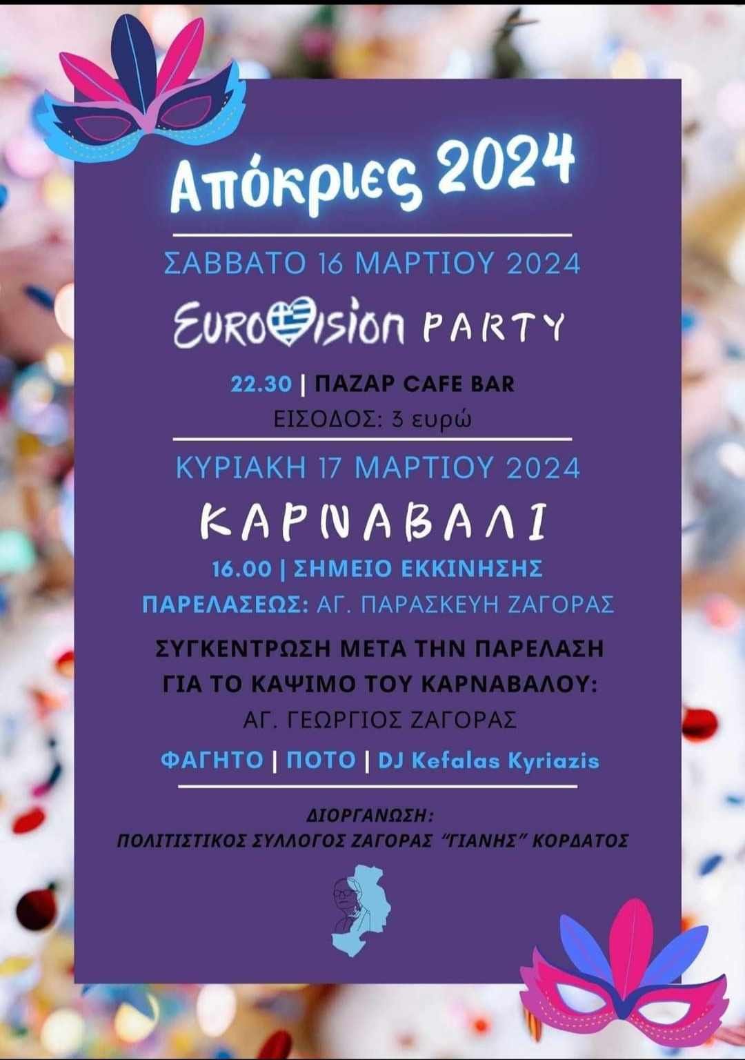 Αποκριάτικο πάρτι το Σάββατο 16 Μαρτίου στη Ζαγορά. Ειδικότερα θα γίνει Eurovision party στις 22:30 στο ΠΑΖΑΡ café bar με είσοδο 3 ευρώ. Την Κυριακή 17 Μαρτίου στις 16:00 θα ακολουθήσει καρναβάλι με σημείο εκκίνησης της παρέλασης την Αγ. Παρασκευή Ζαγοράς. Συγκέντρωση μετά την παρέλαση για το κάψιμο του καρνάβαλου στον Άγιο Γεώργιο Ζαγοράς.