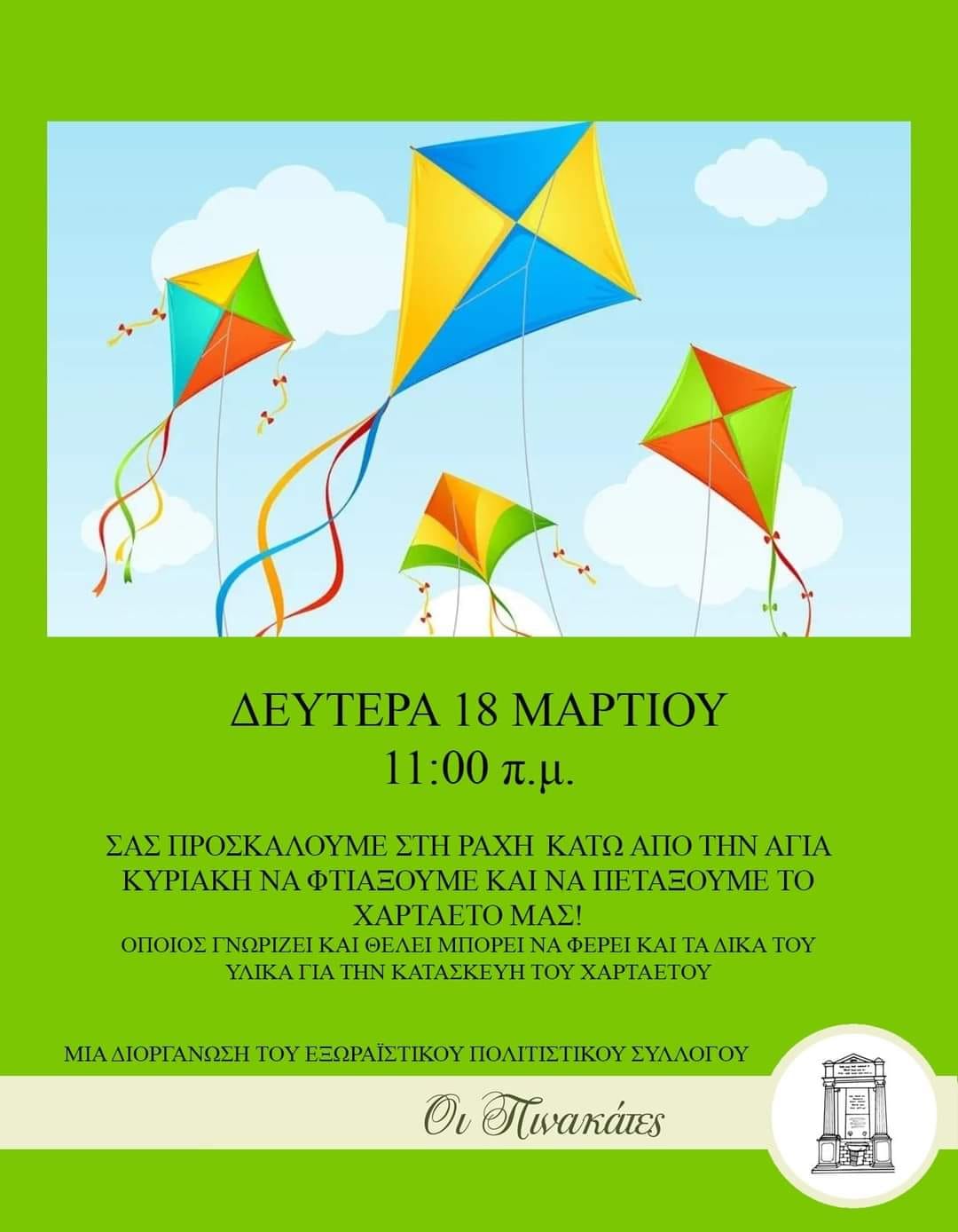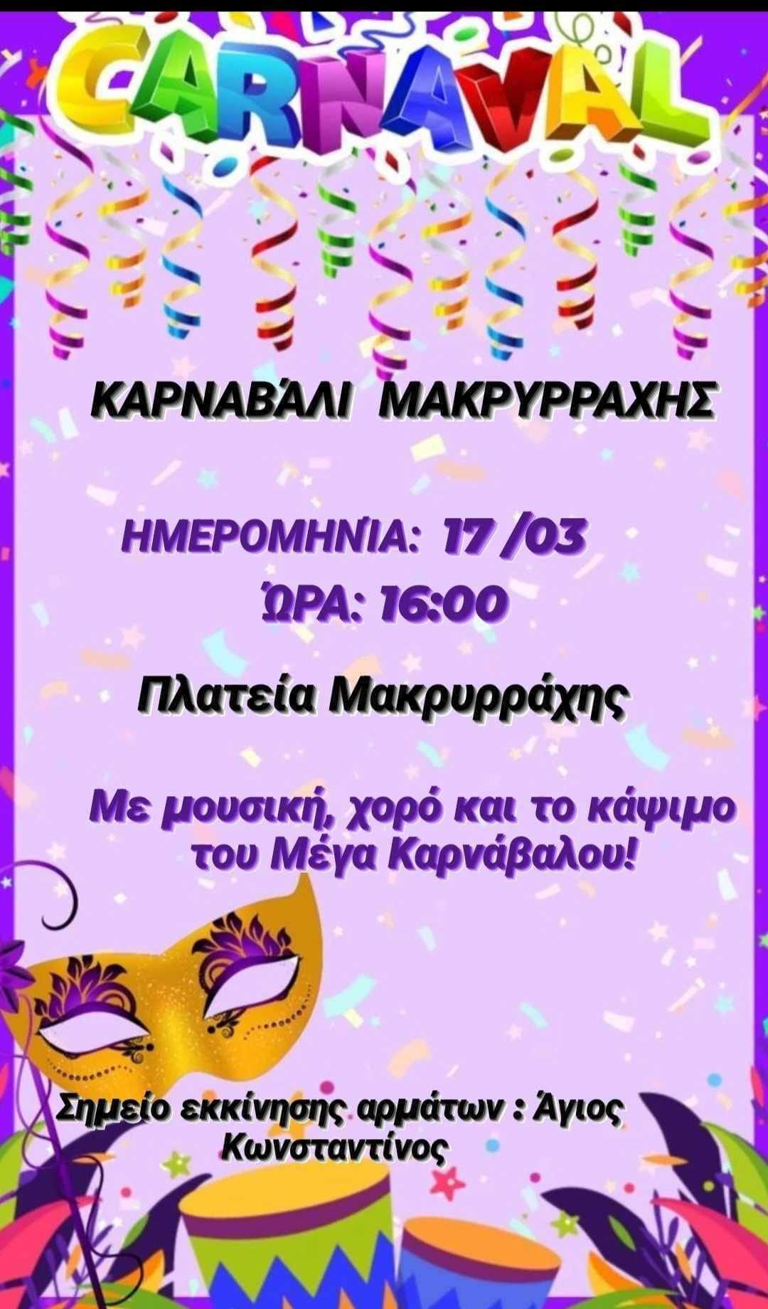 Καρναβάλι διοργανώνεται και στην πλατεία Μακρυρράχης την Κυριακή 17 Μαρτίου στις 16:00 με μουσική, χορό και το κάψιμο του Μέγα Καρνάβαλου. Σημείο εκκίνησης αρμάτων: Άγιος Κωνσταντίνος.