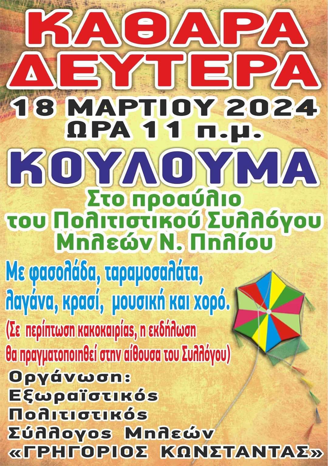 Καθαρά Δευτέρα στις Μηλιές και στις 11 το πρωί θα πραγματοποιηθεί εκδήλωση στο προαύλιο του Πολιτιστικού Συλλόγου Μηλεών, με φασολάδα, ταραμοσαλάτα, λαγάνα, κρασί, μουσική και χορό. Σε περίπτωση κακοκαιρίας η εκδήλωση θα πραγματοποιηθεί στην αίθουσα του Συλλόγου.
