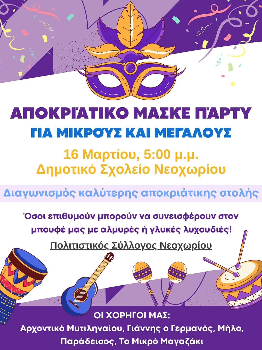Αποκριάτικο πάρτι για μικρούς και μεγάλους το Σάββατο 16 Μαρτίου στις 5μ.μ. στο Δημοτικό Σχολείο Νεοχωρίου. Θα γίνει διαγωνισμός καλύτερης αποκριάτικης στολής.