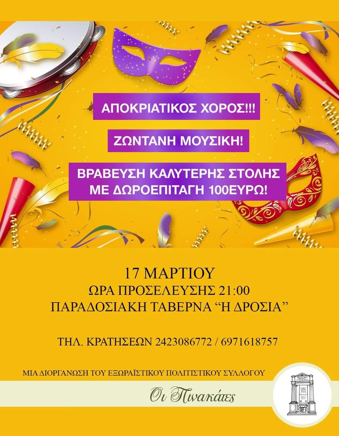 Αποκριάτικος χορός διοργανώνεται στις Πινακάτες την Κυριακή 17 Μαρτίου στις 21:00 στην παραδοσιακή ταβέρνα «Η Δροσιά», με ζωντανή μουσική και βράβευση της καλύτερης στολής με δωροεπιταγή 100 ευρώ. Το γλέντι συνεχίζεται και την Καθαρά Δευτέρα στις 11 το πρωί κάτω από την Αγία Κυριακή για το πέταγμα του χαρταετού.