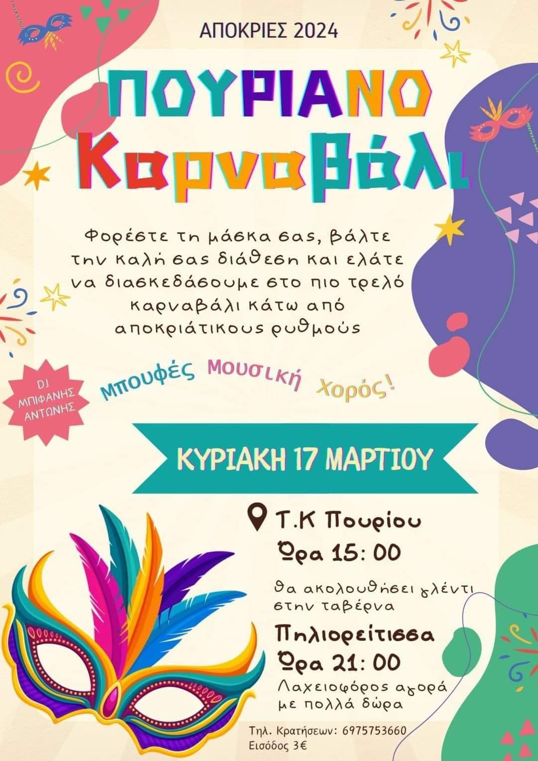 Τις Απόκριες γιορτάζει και το Πουρί, με το Πουριανό καρναβάλι την Κυριακή 17 Μαρτίου στις 15:00. Θα ακολουθήσει γλέντι στην ταβέρνα Πηλιορείτισσα στις 21:00. Θα υπάρχει λαχειοφόρος αγορά με πολλά δώρα.