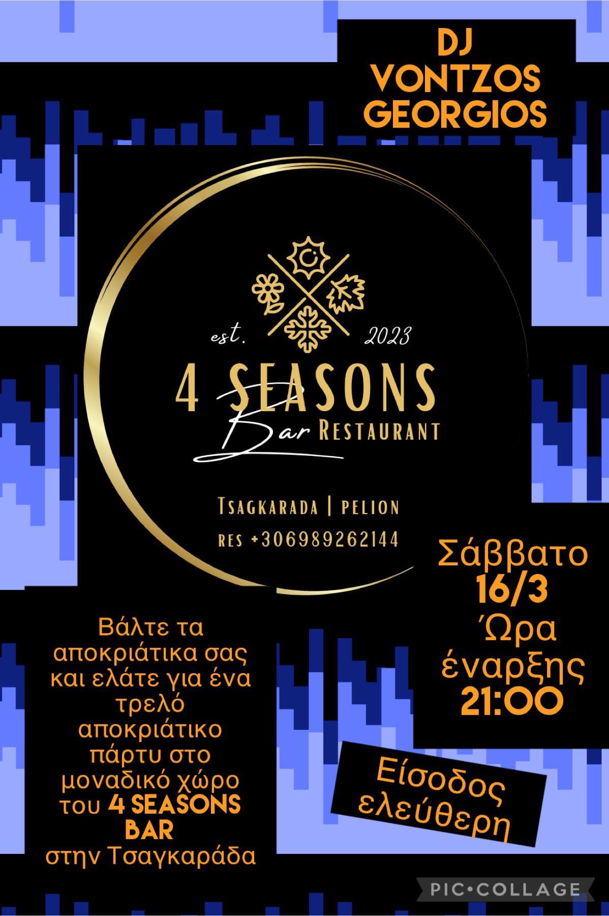 Αποκριάτικο πάρτι διοργανώνεται και στην Τσαγκαράδα στον χώρο του 4seasons το Σάββατο 16 Μαρτίου στις 21:00 με είσοδο ελεύθερη.