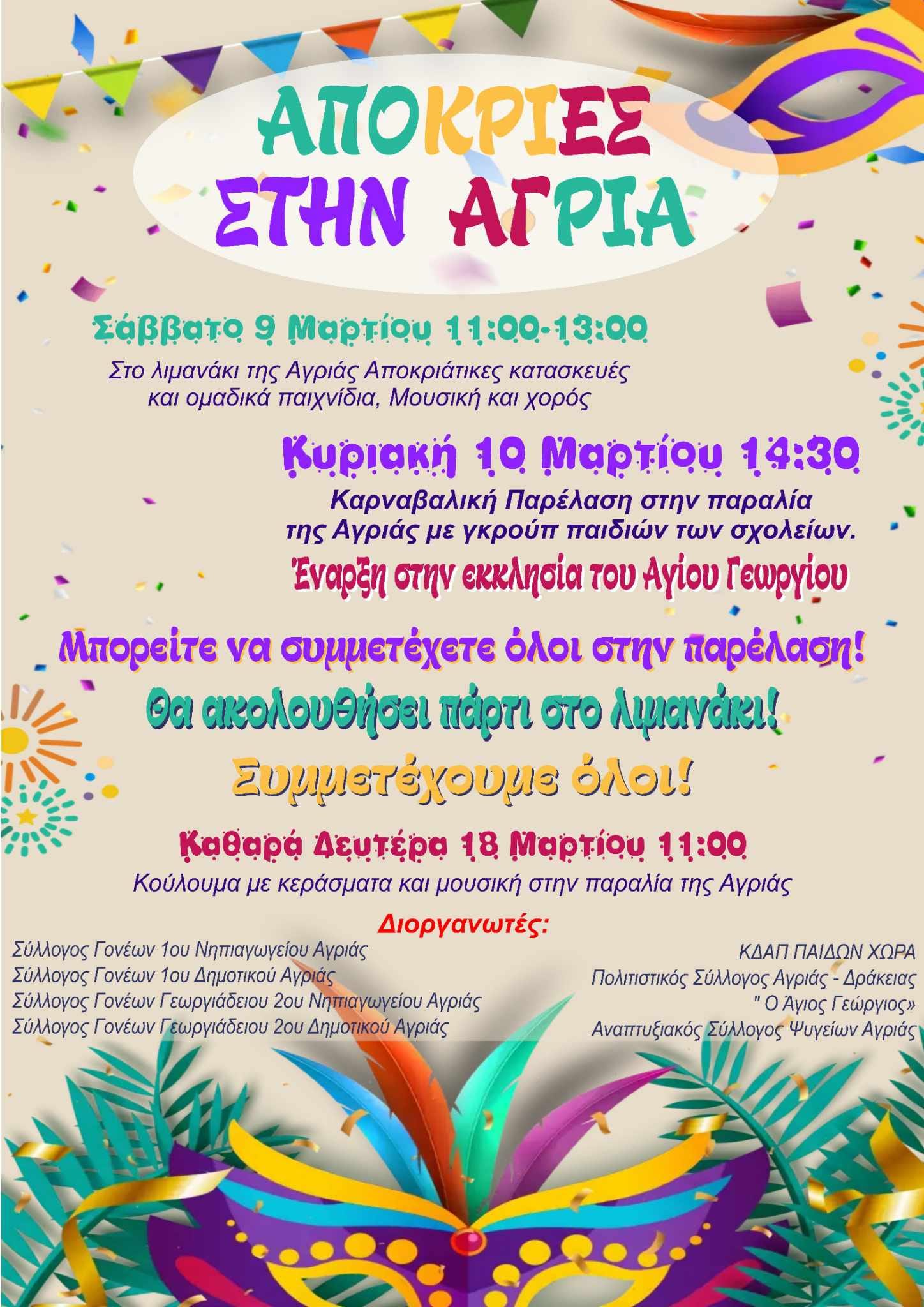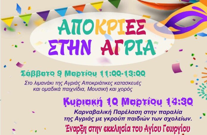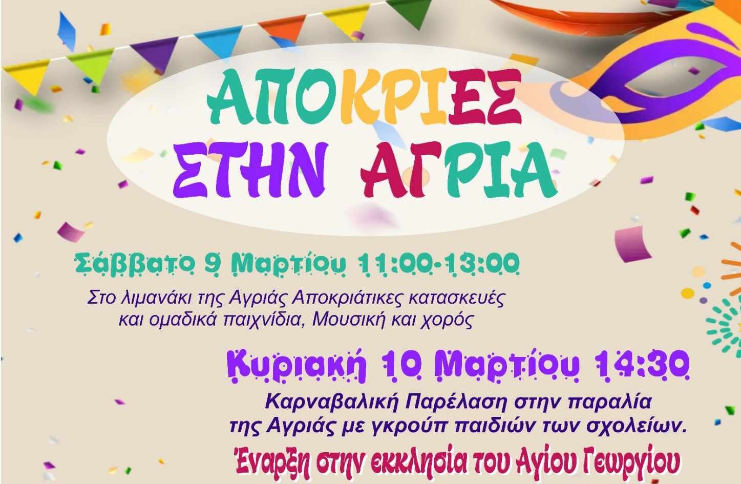 Την Κυριακή 10 Μαρτίου στις 14:30 θα διεξαχθεί καρναβαλική παρέλαση στην παραλία της Αγριάς με γκρουπ παιδιών των σχολείων της περιοχής. Η παρέλαση θα ξεκινήσει από την εκκλησία του Αγίου Γεωργίου και μπορούν να συμμετέχουν όλοι. Θα ακολουθήσει πάρτι στο λιμανάκι.