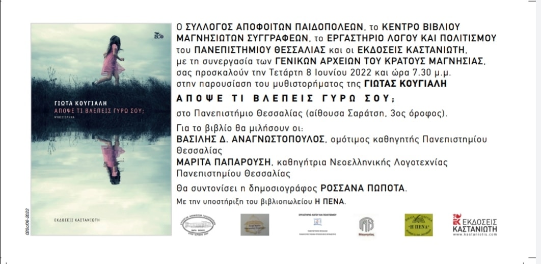 Ο Σύλλογος Αποφοίτων Παιδοπόλεων, το Κέντρο Βιβλίου Μαγνησιωτών Συγγραφέων, το Εργαστήριο λόγου και πολιτισμού του ΠΘ και οι εκδόσεις Καστανιώτη με τη συνεργασία των Γενικών Αρχείων του Κράτους Μαγνησίας πραγματοποιούν εκδήλωση παρουσίασης του μυθιστορήματος “Απόψε τι βλέπεις γύρω σου;” της συγγραφέως Γιώτας Κούγιαλη, που θα γίνει την Τετάρτη 8 Ιουνίου 2022 στην αίθουσα “Σαράτση” του Πανεπιστημίου Θεσσαλίας (3ος όροφος) και ώρα 7:30 το βράδυ.