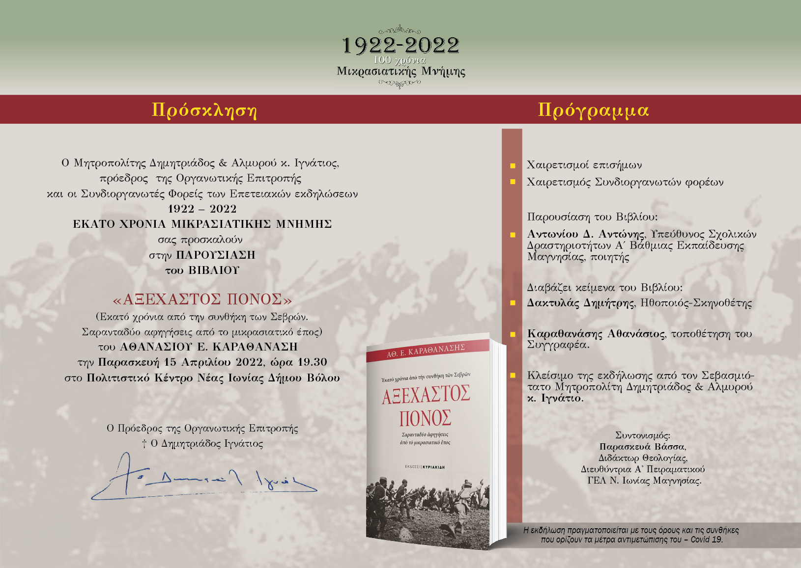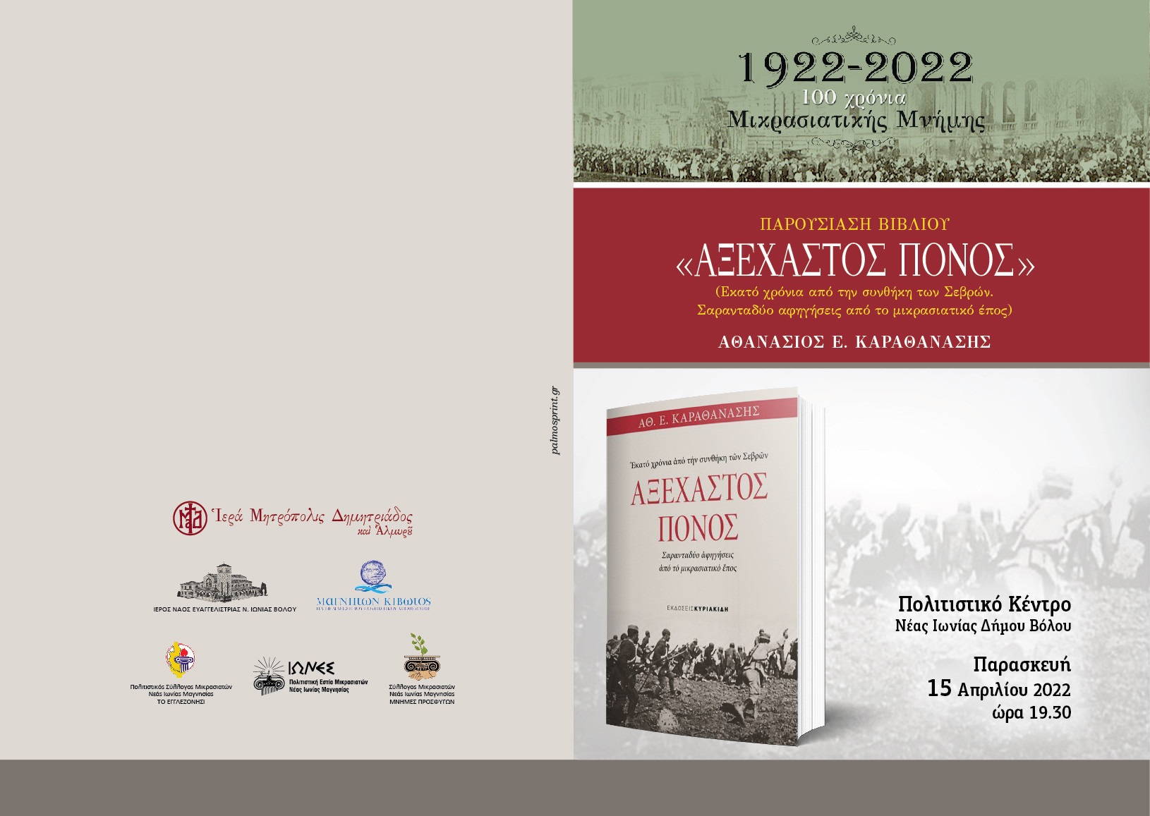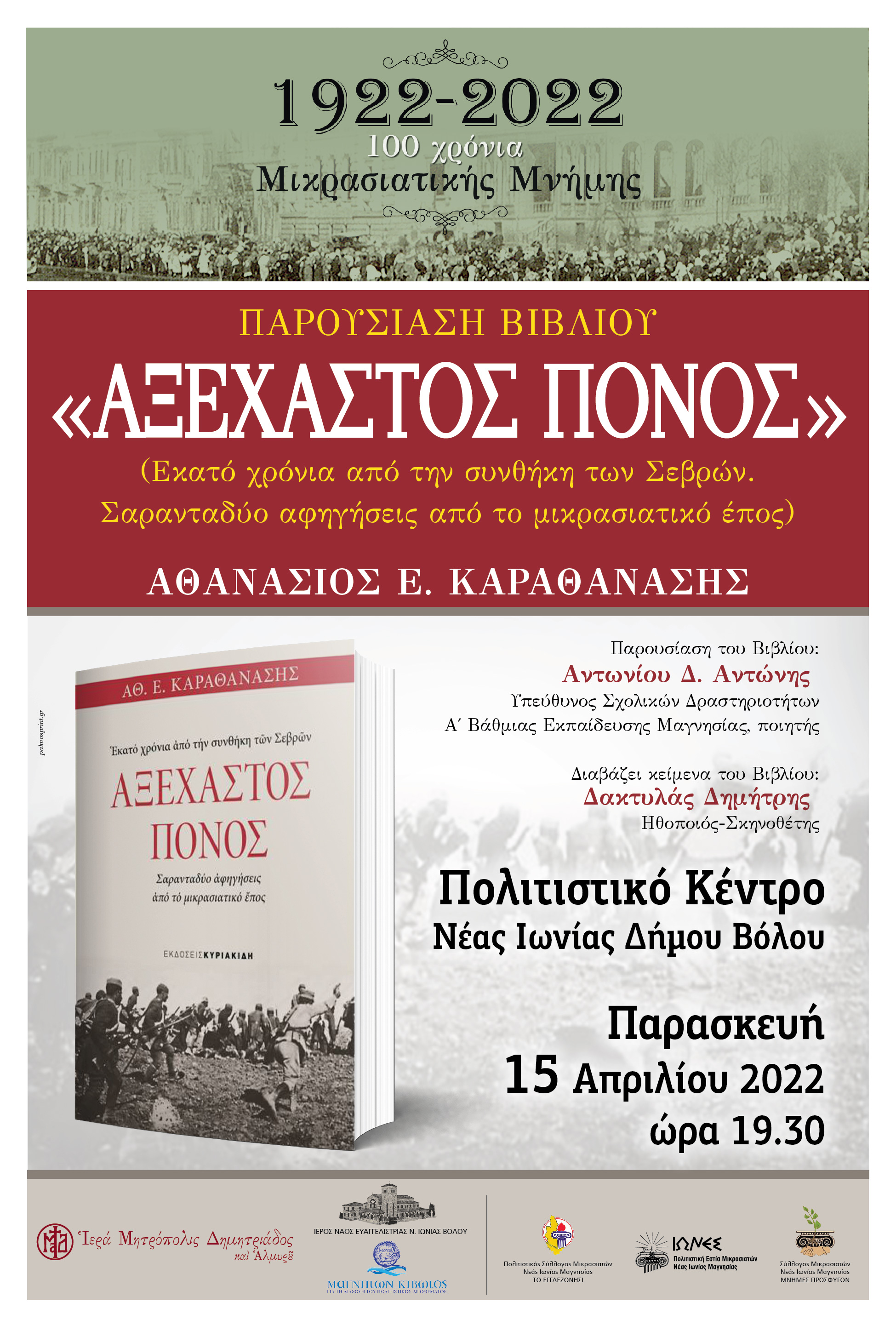 Η Πολιτιστική Εστία Μικρασιατών Νέας Ιωνίας Μαγνησίας «ΙΩΝΕΣ», έχει την ευθύνη της οργάνωσης της παρουσίασης ενός εξαιρετικά ενδιαφέροντος βιβλίου, απολύτως μέσα στο πνεύμα των Επετειακών Εκδηλώσεων για τα 100 χρόνια από την Μικρασιατική Καταστροφή με τίτλο «Αξέχαστος Πόνος», που θα πραγματοποιηθεί την Παρασκευή 15 Απριλίου 2022, στις 19.30 το βράδυ, στο Πολιτιστικό Κέντρο Ν. Ιωνίας, Δήμου Βόλου. Σύμφωνα με την πρόσκληση, την παρουσίαση του Βιβλίου θα κάνει ο Υπεύθυνος Σχολικών Δραστηριοτήτων Α’ Βάθμιας Εκπαίδευσης Μαγνησίας και ποιητής, Αντώνης Δ. Αντωνίου, από το οποίο θα διαβάζει κείμενα ο Ηθοποιός και Σκηνοθέτης Δημήτρης Δακτυλάς. Στη συνέχεια θα λάβει τον λόγο ο Συγγραφέας Αθανάσιος Καραθανάσης, για να κάνει το κλείσιμο της εκδήλωσης ο Σεβ. Μητροπολίτης Δημητριάδος & Αλμυρού κ. Ιγνάτιο.
