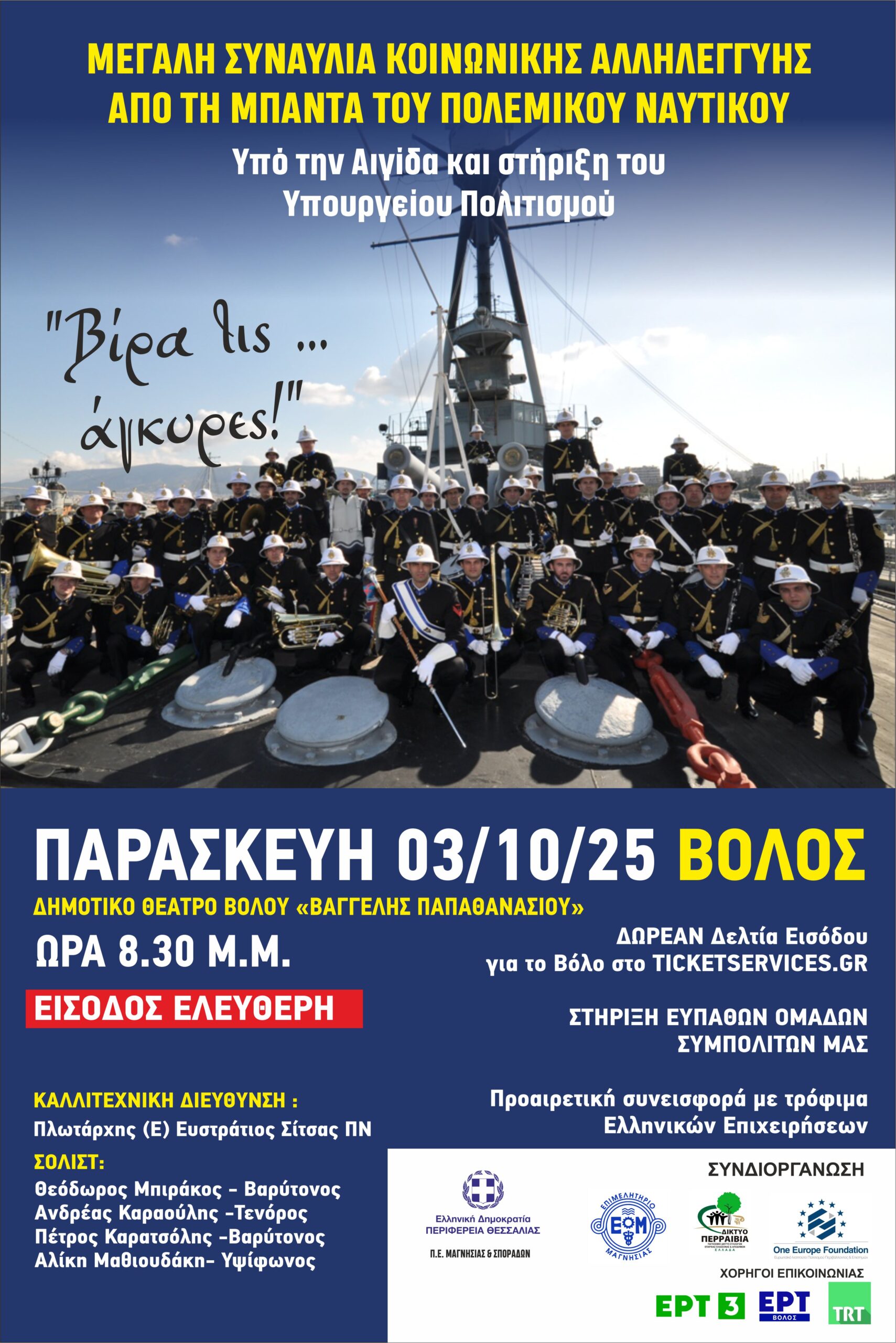 Η εξαιρετική Μπάντα του Πολεμικού Ναυτικού θα πραγματοποιήσει συναυλία την Παρασκευή 3 Οκτωβρίου , στο Δημοτικό Θέατρο Βόλου «Βαγγέλης Παπαθανασίου» με τίτλο «Βίρα τις ..άγκυρες!», που θα περιλαμβάνει τα ομορφότερα τραγούδια της Ελληνικής και παγκόσμιας μουσικής σκηνής, με σκοπό τη στήριξη ευπαθών ομάδων, με τρόφιμα.