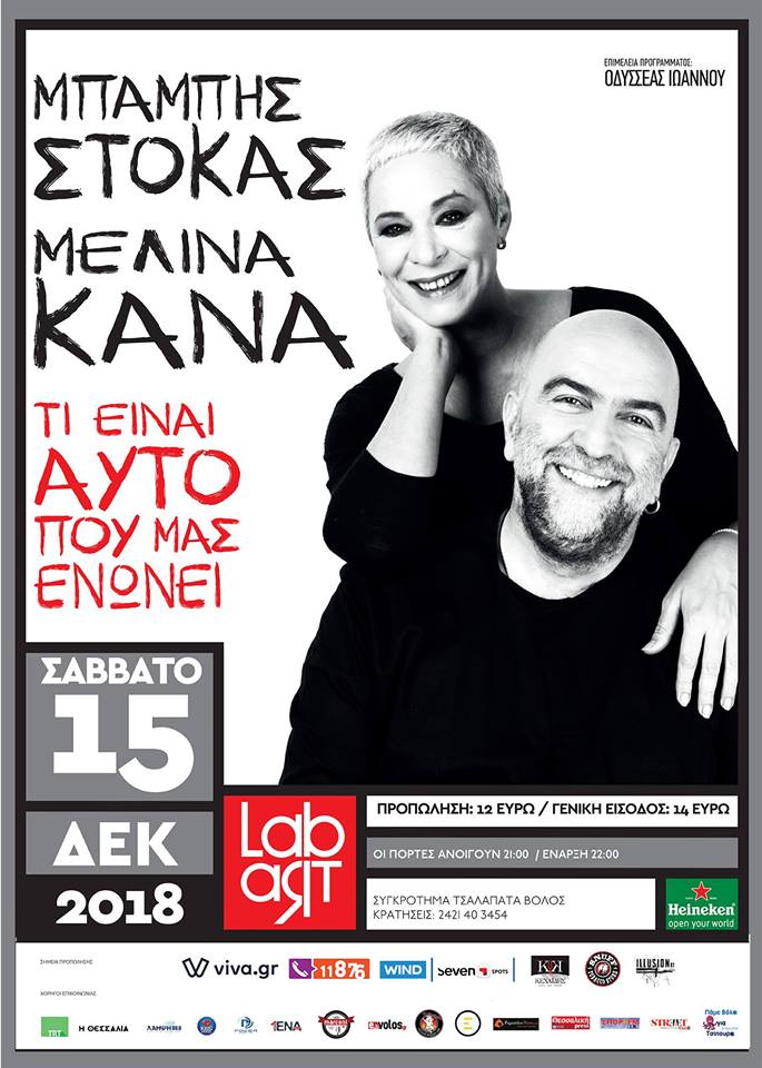 «Τι ΄ναι αυτό που μας ενώνει» είναι ο τίτλος της βραδιάς που θα γίνει το Σάββατο 15 Δεκεμβρίου στο «Lab Art», με πρωταγωνιστές τον Μπάμπη Στόκα και την Μελίνα Κανά, που θα βρεθούν μαζί επί σκηνής, σε ένα πρόγραμμα που έχουν επιμεληθεί με τη συνεργασία του Οδυσσέα Ιωάννου.