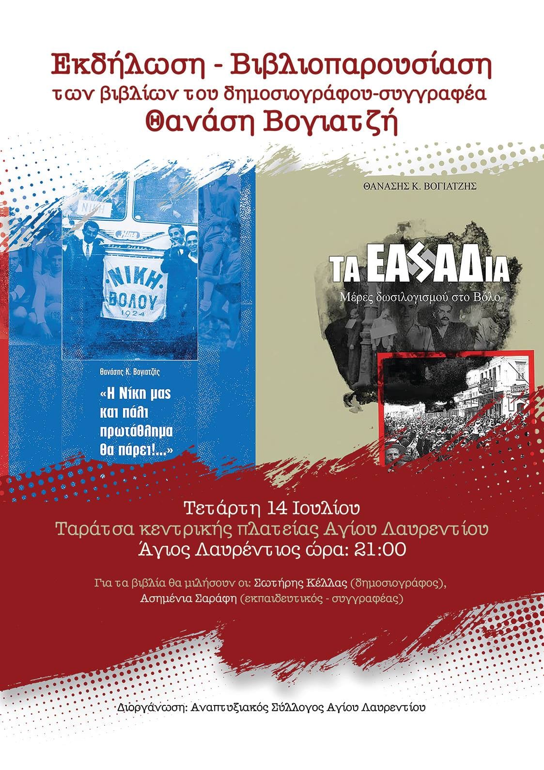 Εκδήλωση – βιβλιοπαρουσίαση των βιβλίων του δημοσιογράφου και συγγραφέα Θανάση Βογιατζή θα γίνει αύριο Τετάρτη 14 Ιουλίου στην ταράτσα της κεντρικής πλατείας του Αγίου Λαυρεντίου στις 9 το βράδυ. Για τα βιβλία θα μιλήσουν ο Σωτήρης Κέλλας δημοσιογράφος και η Ασημένια Σαράφη εκπαιδευτικός και συγγραφέας. Την διοργάνωση έχει αναλάβει ο Αναπτυξιακός Σύλλογος Αγίου Λαυρεντίου.
